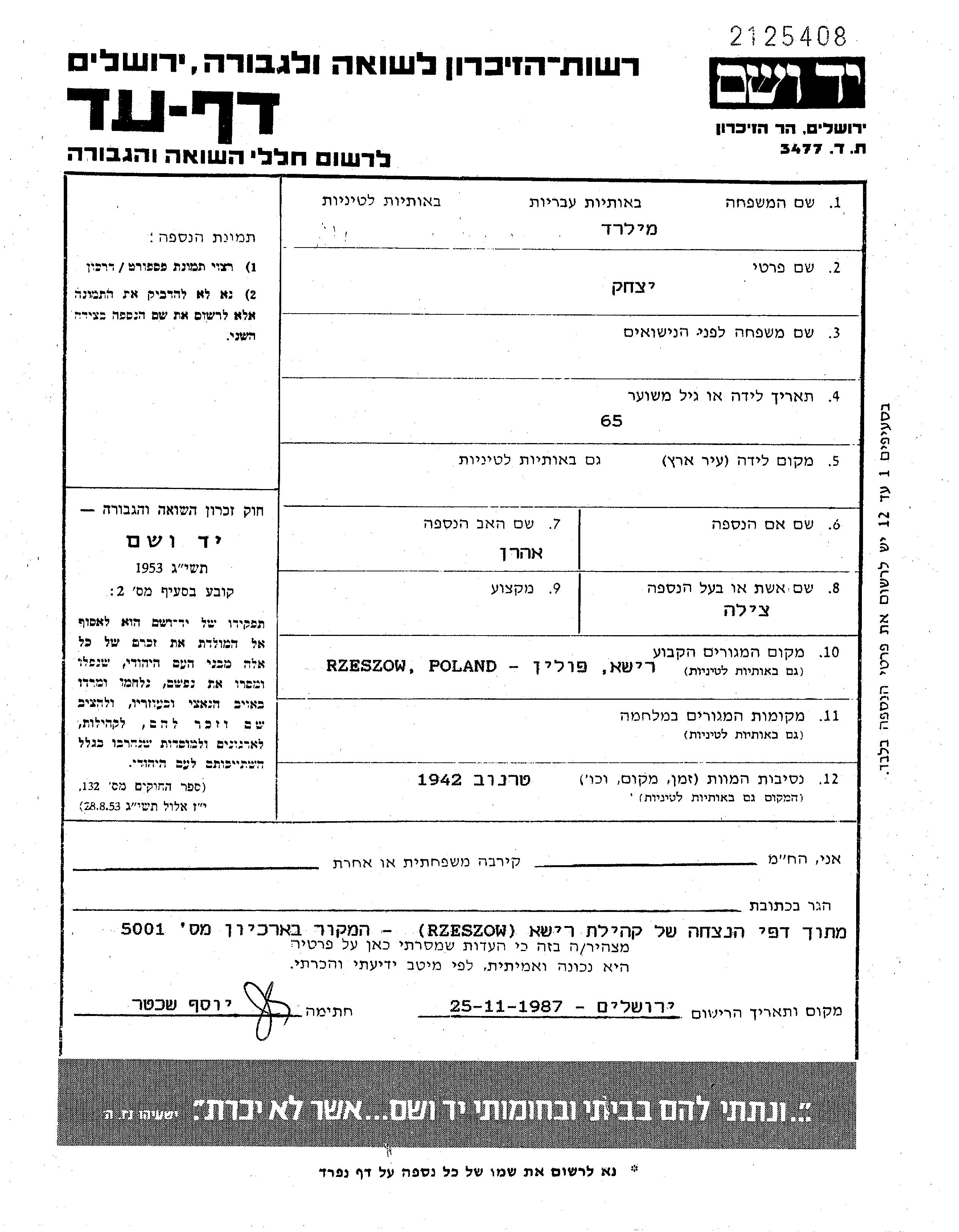 Milrad Ytzkhak Rzeszow, Pologne Feuille de témoignage