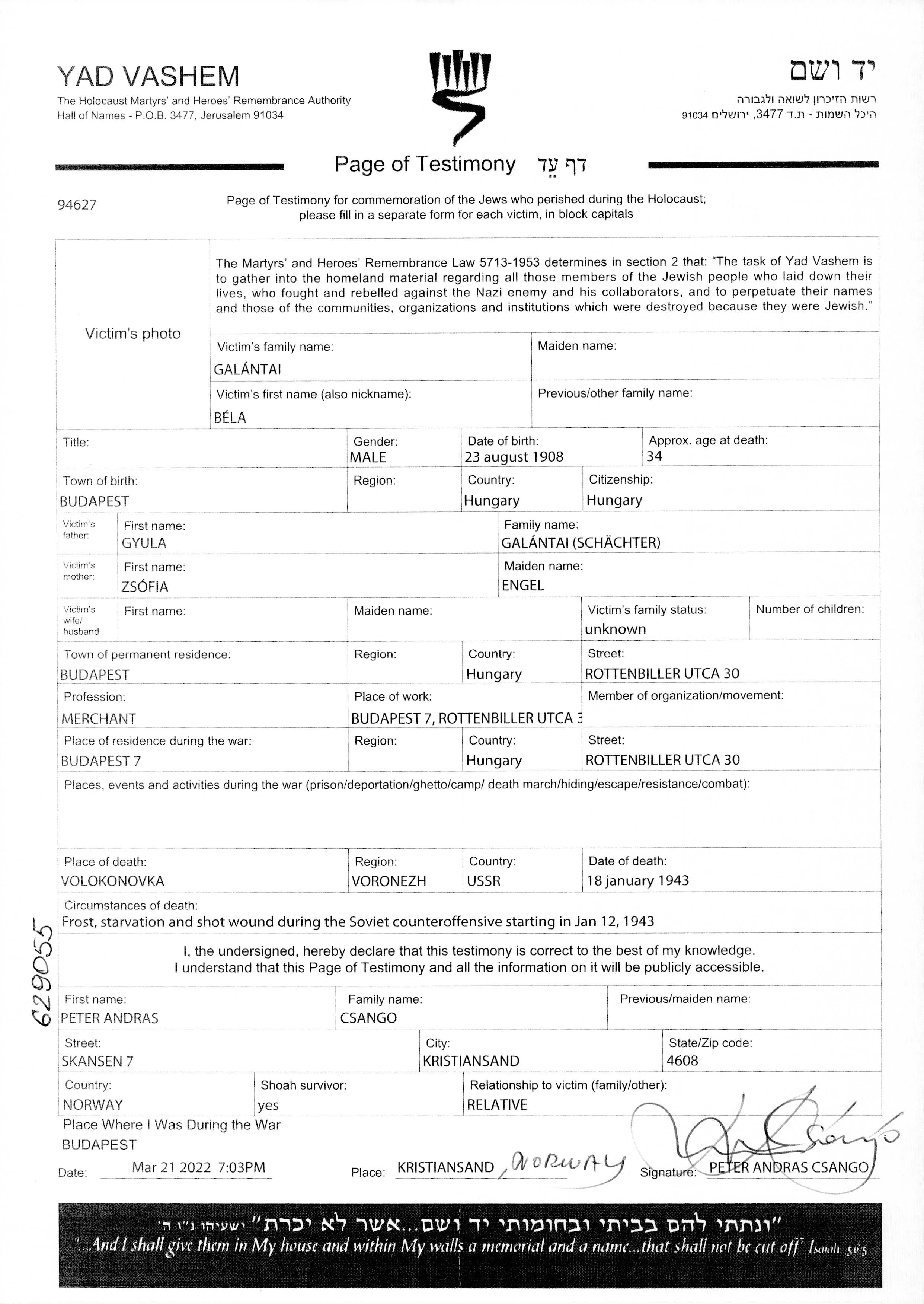 Bela Galántai est né à Budapest, Hongrie en 1908. Il était Peintre. Avant la seconde guerre mondiale il vivait à Budapest, Hongrie. Bela a été assassiné pendant la Shoah. Lieu de la mort: Volokonovka, Russie (URSS) en 18/01/1943.