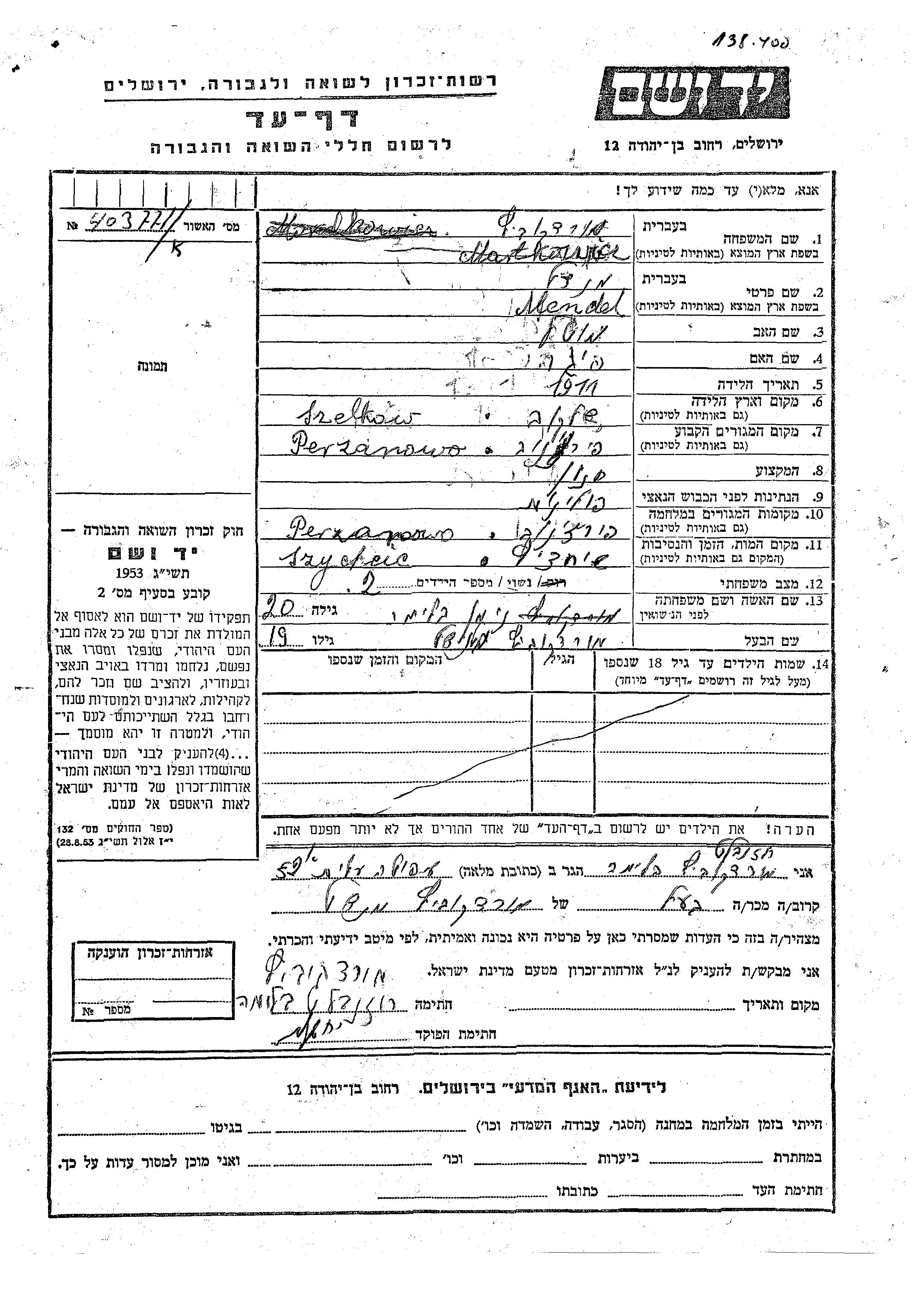 Martkowicz Mendel 1911 Pruzanow, Pologne Feuille de témoignage