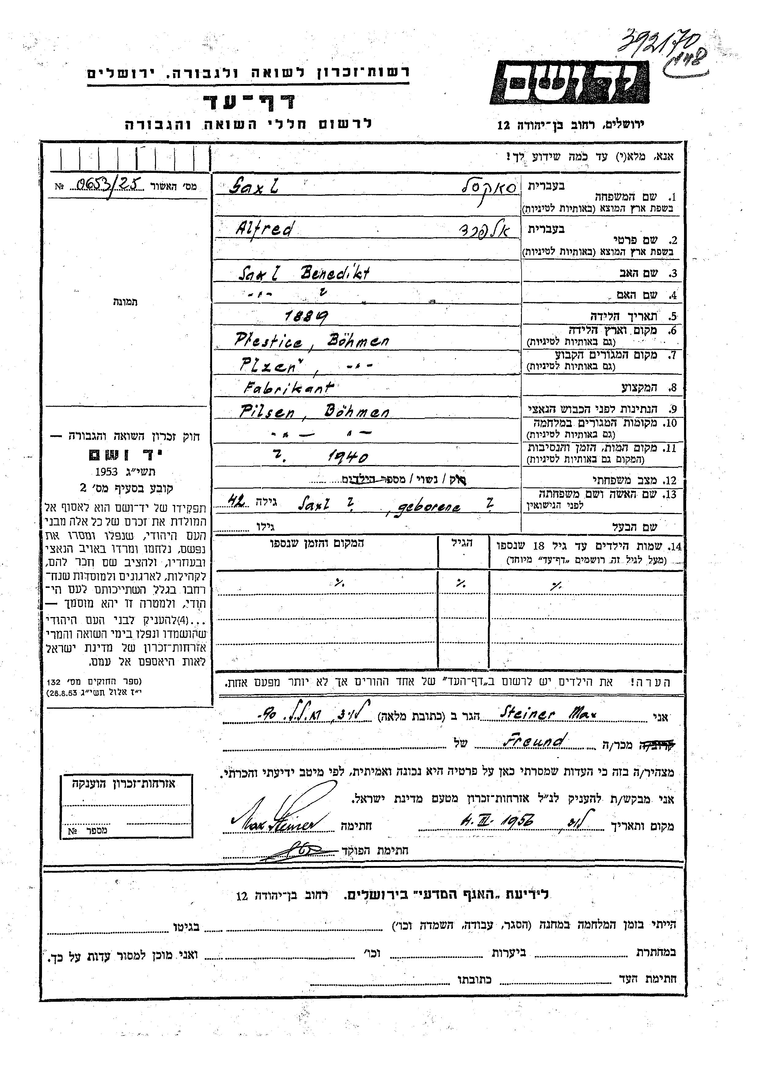 Saxl Alfred 1889 Pilsen, Tchécoslovaquie Feuille de témoignage