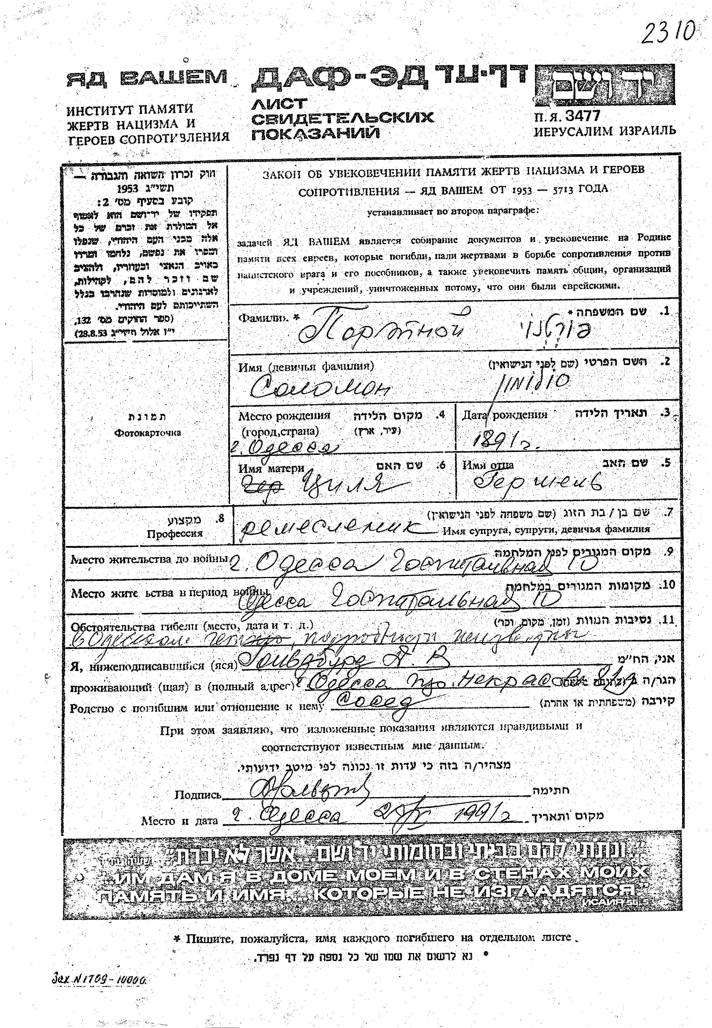 Portnoy | Solomon | 1891 | Odessa, Ukraine (URSS) | Feuille de témoignage |