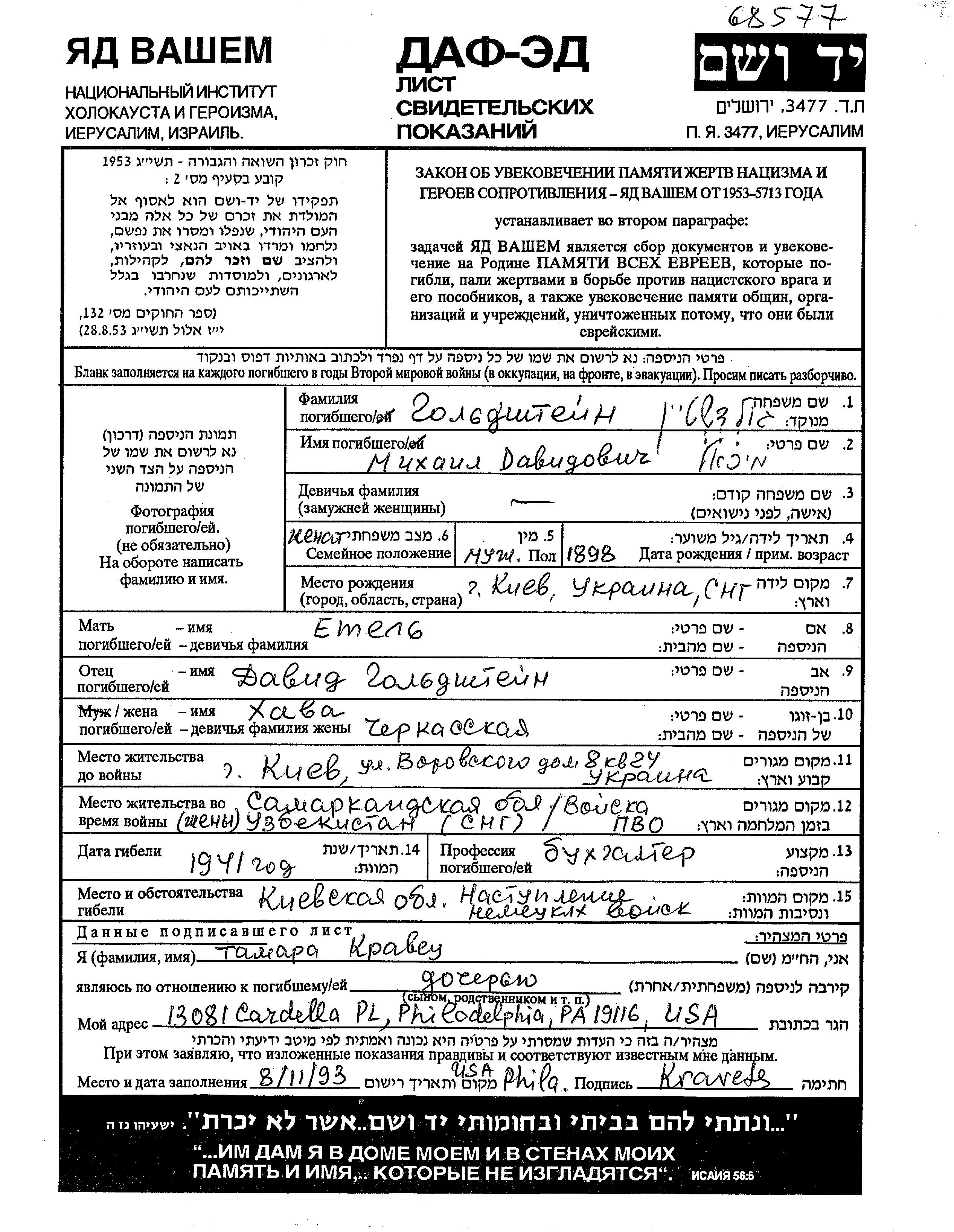 Goldshtein Mikhail Moisha 1898 Kiyev, Ukraine (URSS) Feuille de témoignage