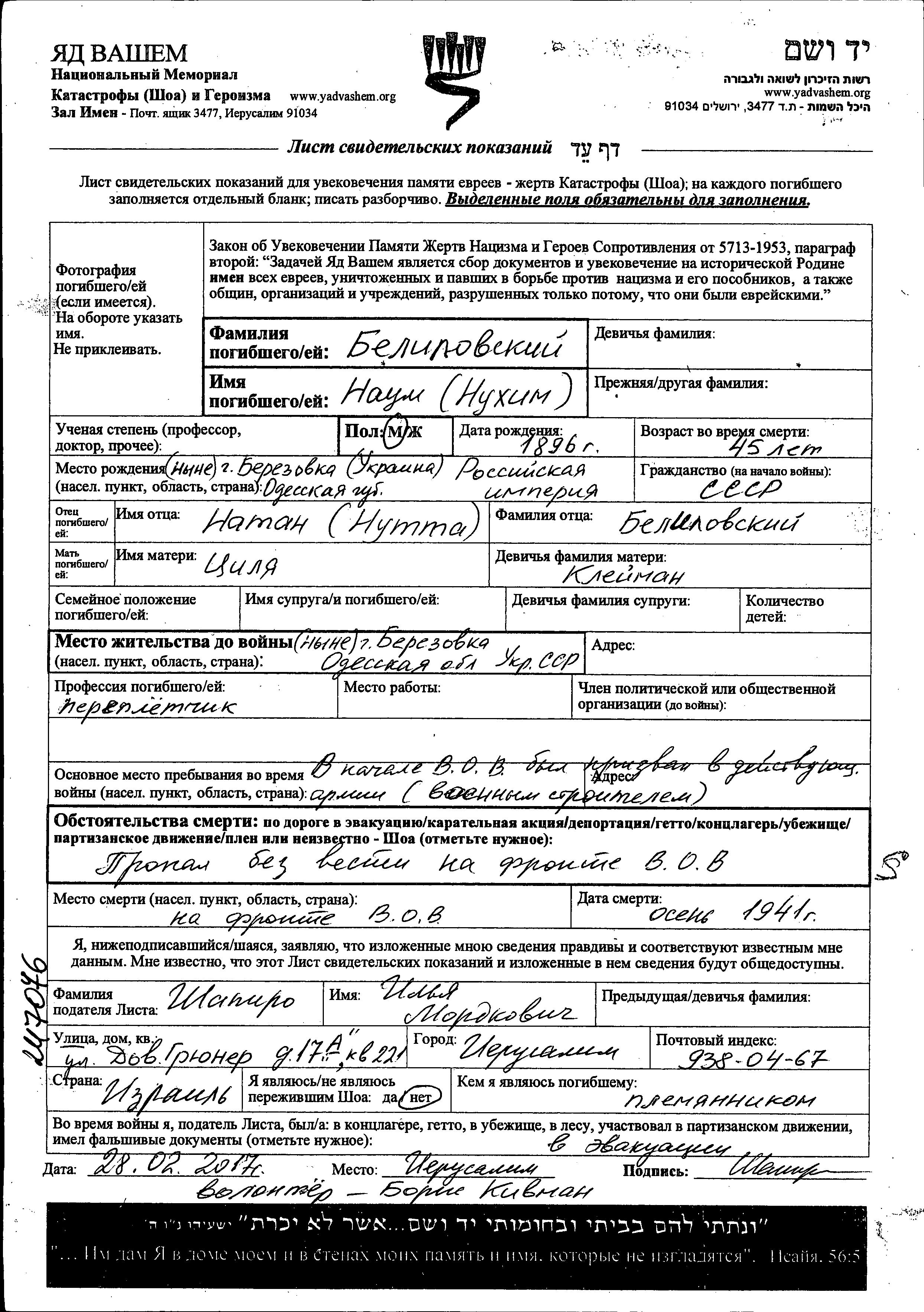 Naum Belilovski est né à Berezovka, Ukraine (URSS) en 1896. Avant la seconde guerre mondiale il vivait à Berezovka, Ukraine (URSS).