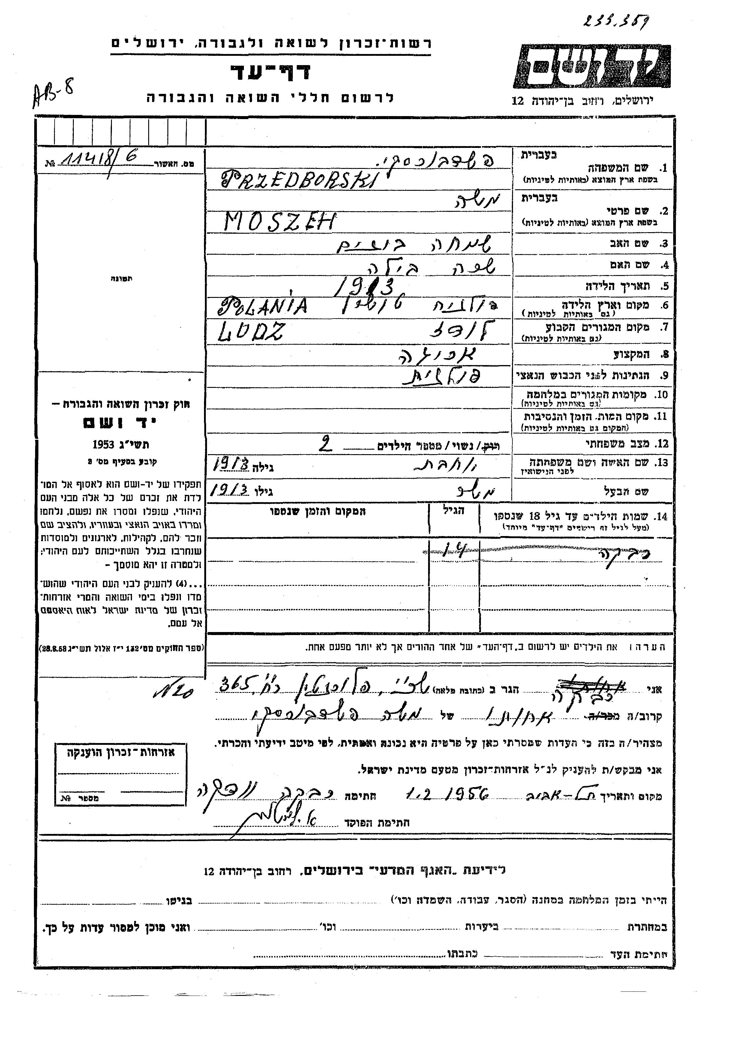 Yad Vashem - Pages of Testimony Names Memorial Collection