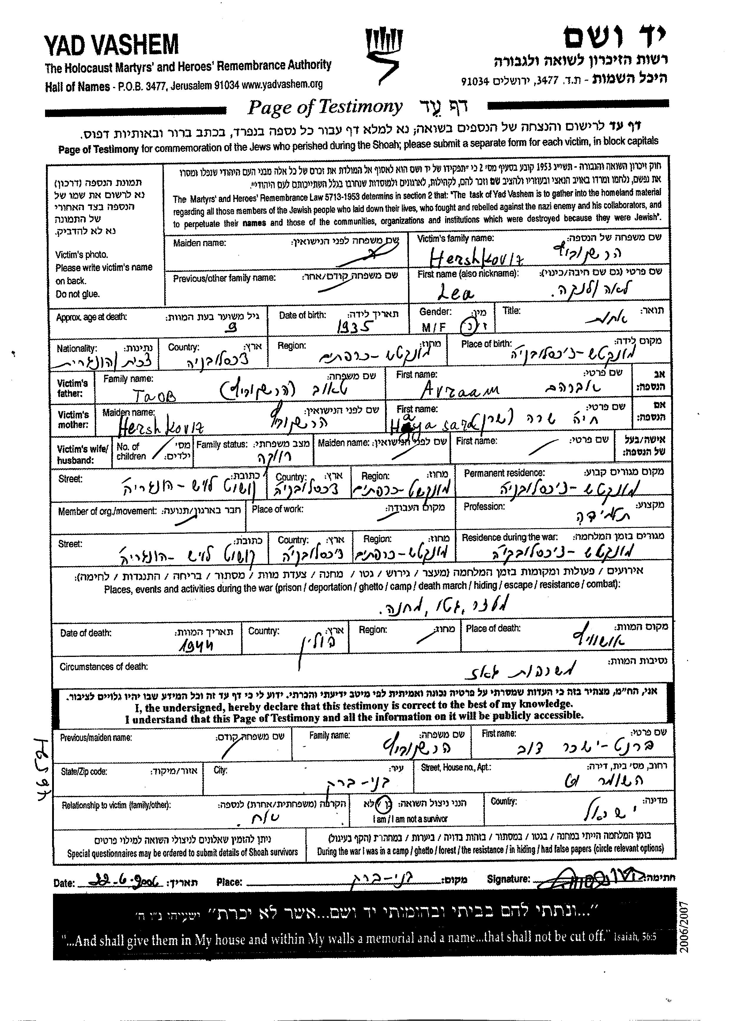 Hershkovitz Taub Lea Lenka 1935 Munkacs, Tchécoslovaquie Feuille de témoignage
