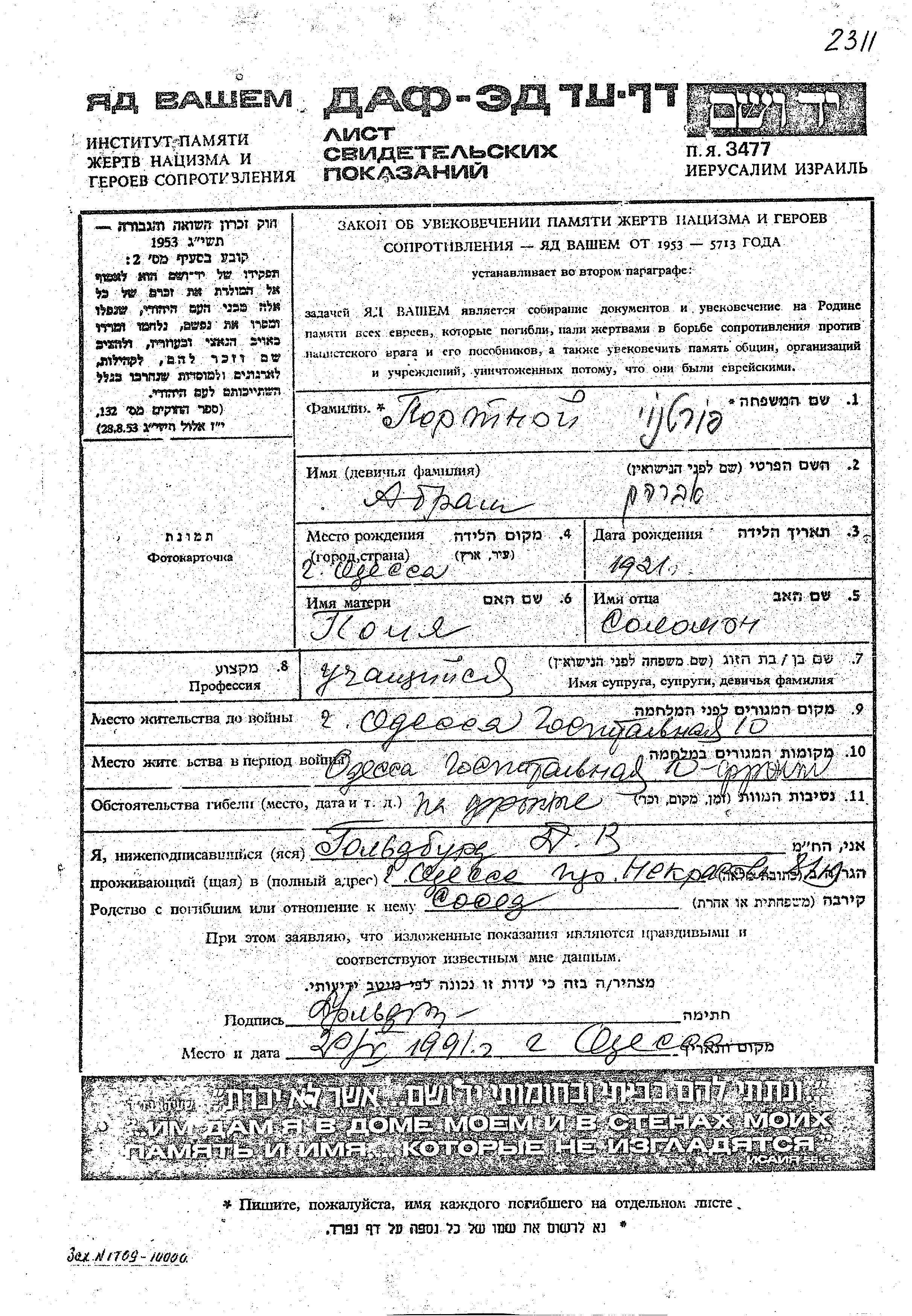 Portnoy | Abram | 1921 | Odessa, Ukraine (URSS) | Feuille de témoignage |