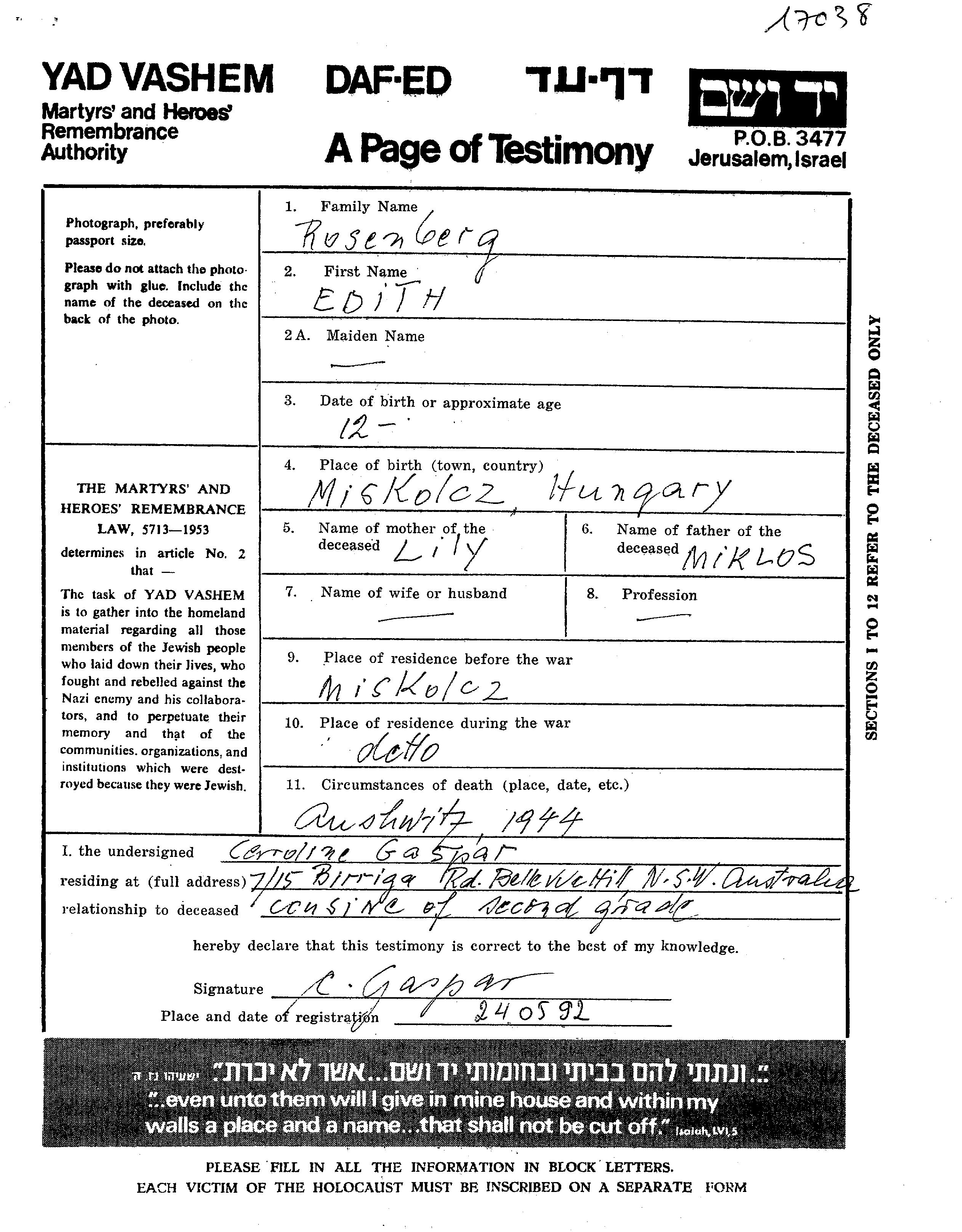 Edith Rosenberg est née à Miskolc, Hongrie en 1932. Avant la seconde guerre mondiale elle vivait à Miskolc, Hongrie.