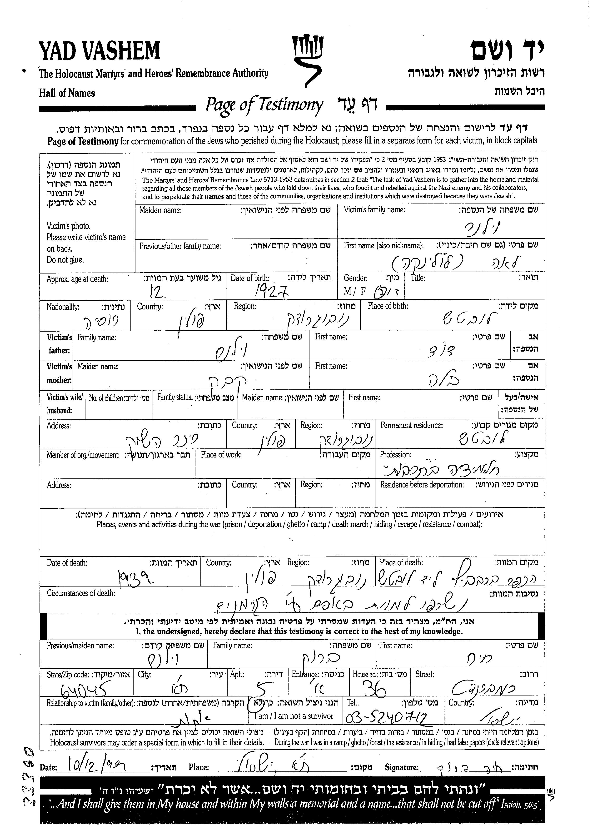 Yad Vashem - Pages of Testimony Names Memorial Collection