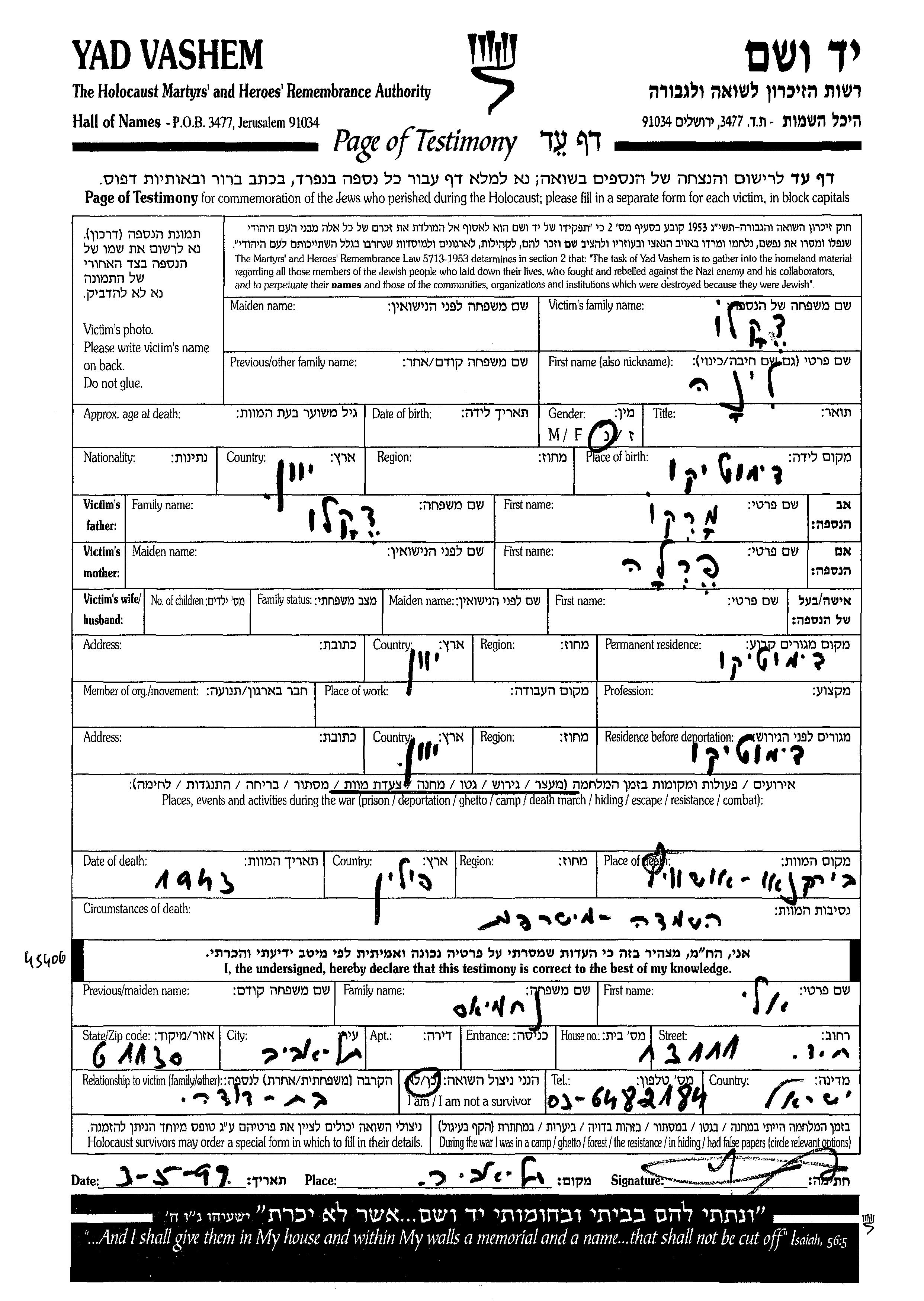 Yad Vashem - Pages of Testimony Names Memorial Collection
