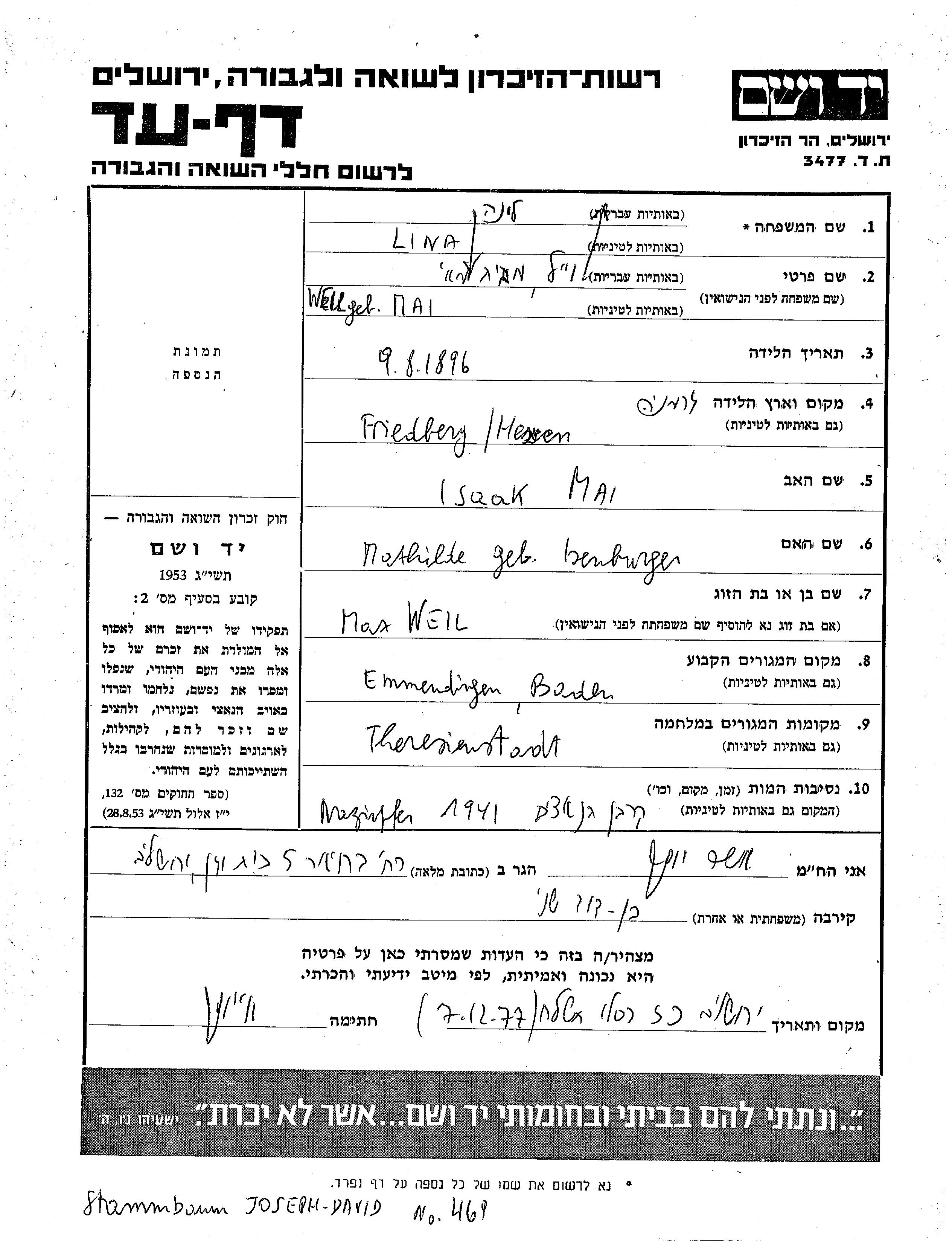 | Weil | Lina | 1896 | endroit inconnu, | Feuille de témoignage (digitale) |