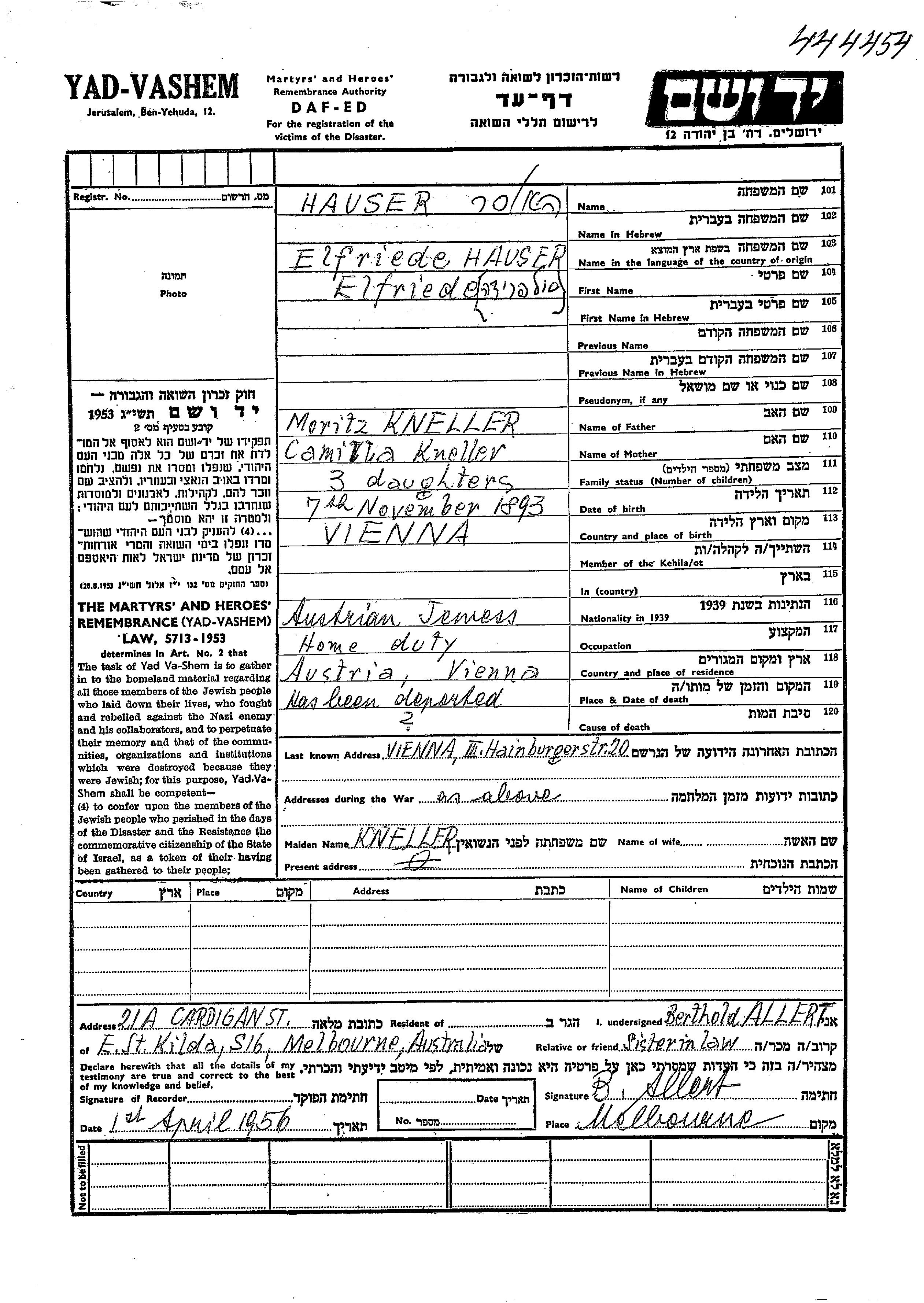 Hauzer Elfriede 1893 Vienna, Autriche Feuille de témoignage