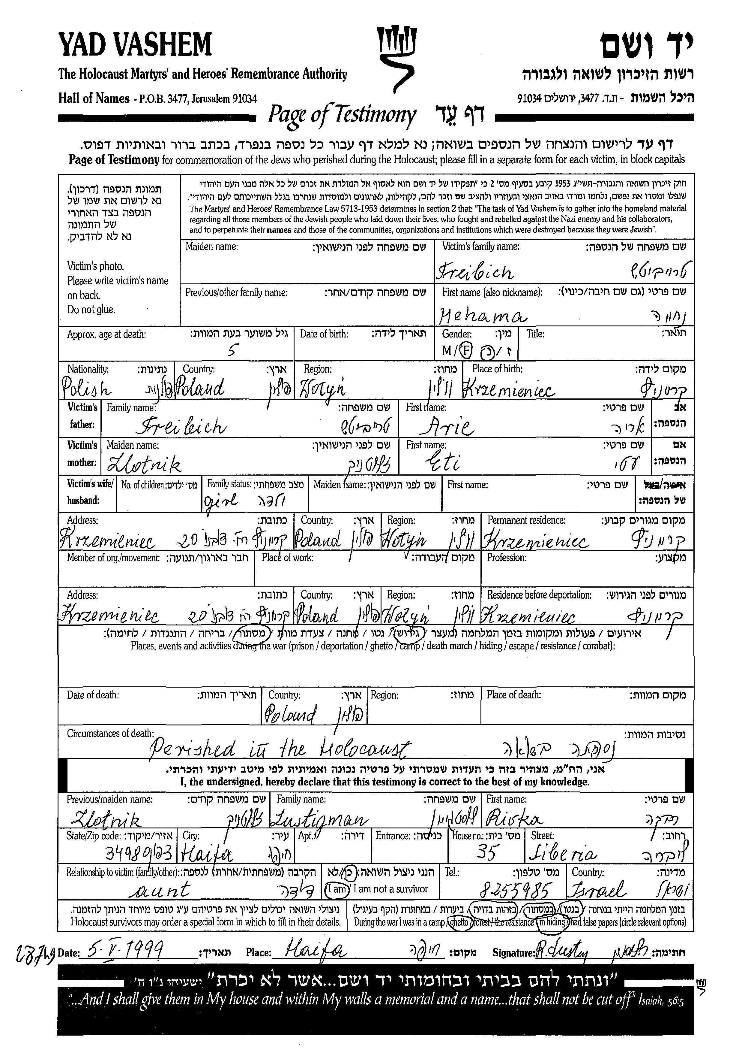 Treibich Nehama Krzemieniec, Pologne Feuille de témoignage