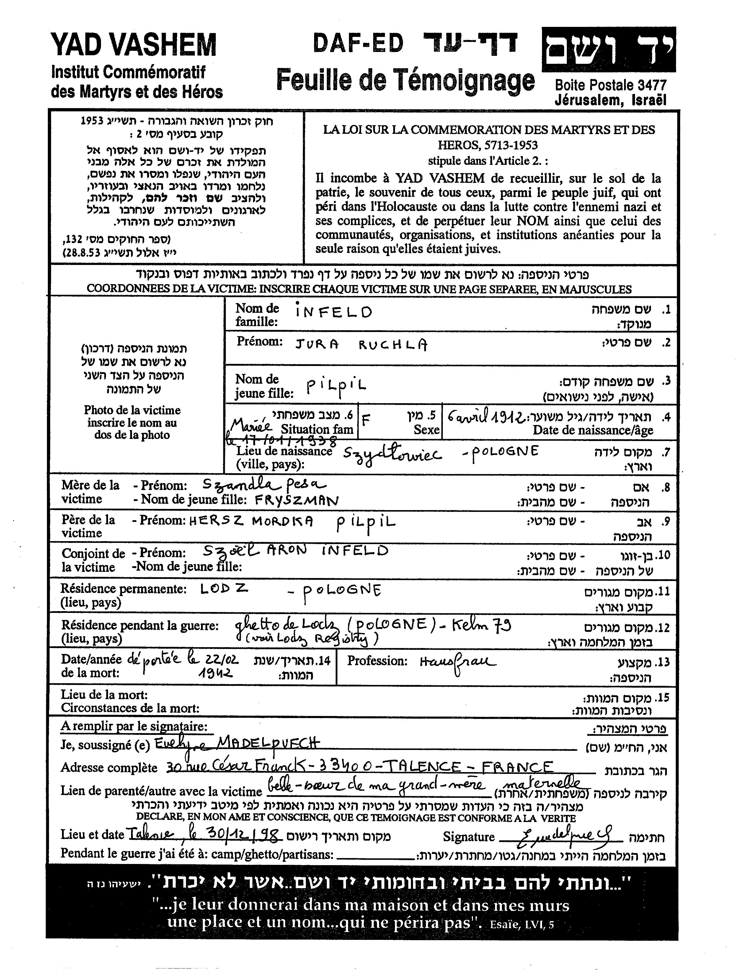 Infeld | Jura Ruchla | 1912 | Lodz, Pologne | Feuille de témoignage |