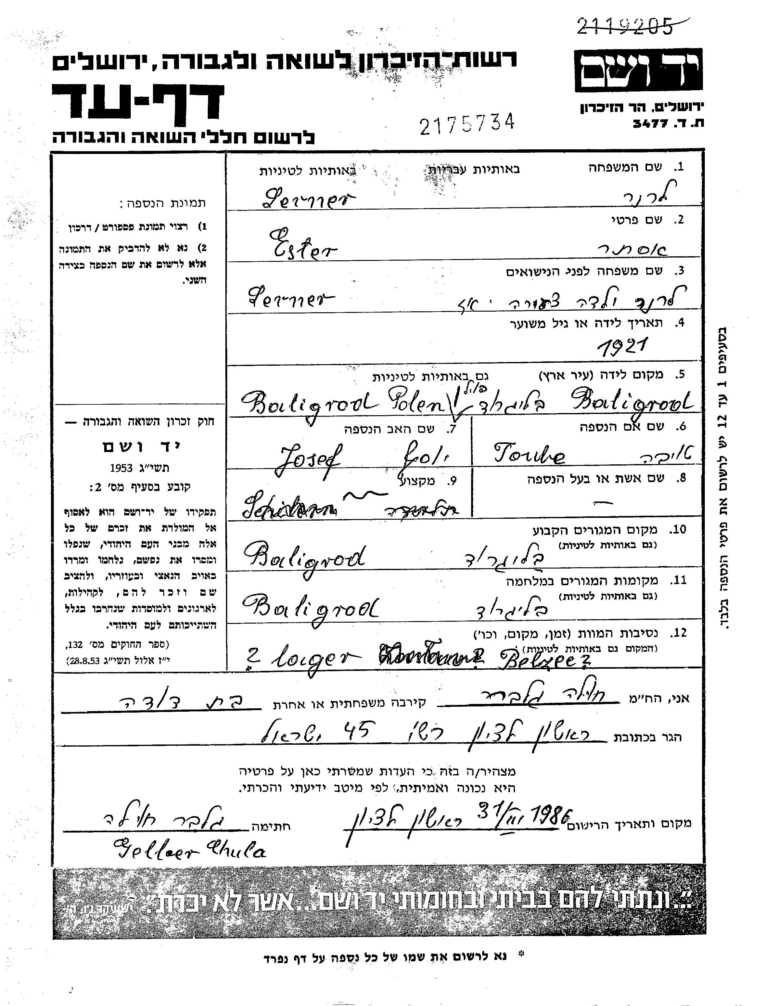 Lerner Ester 1921 Baligrod, Pologne Feuille de témoignage