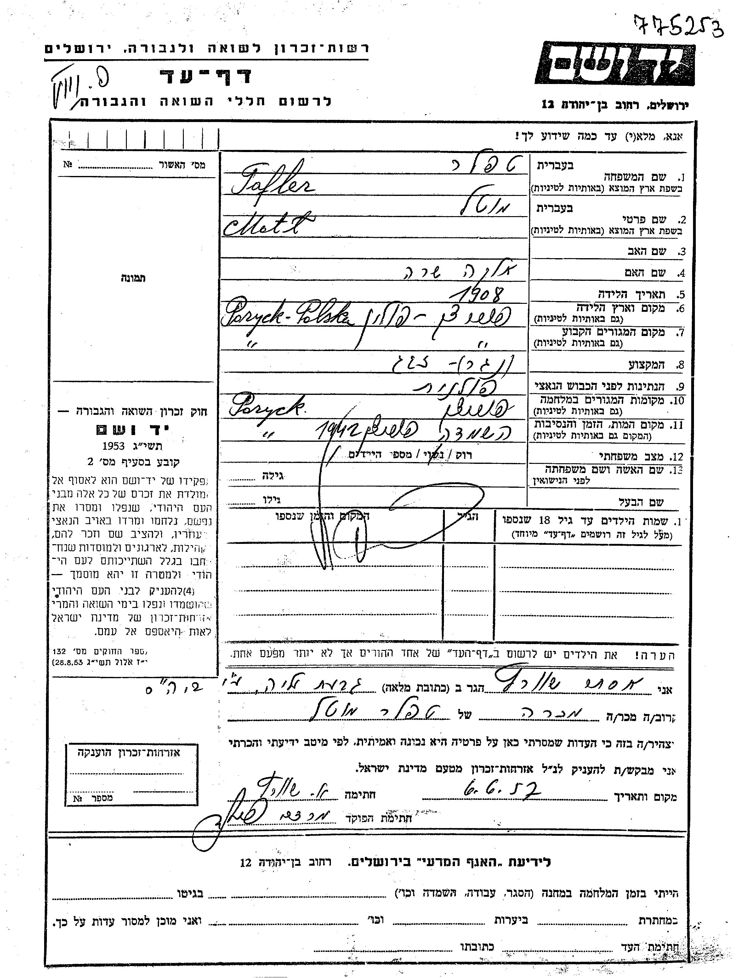 Tafler Tepler Motl Motel 1908 Poryck, Pologne Feuille de témoignage