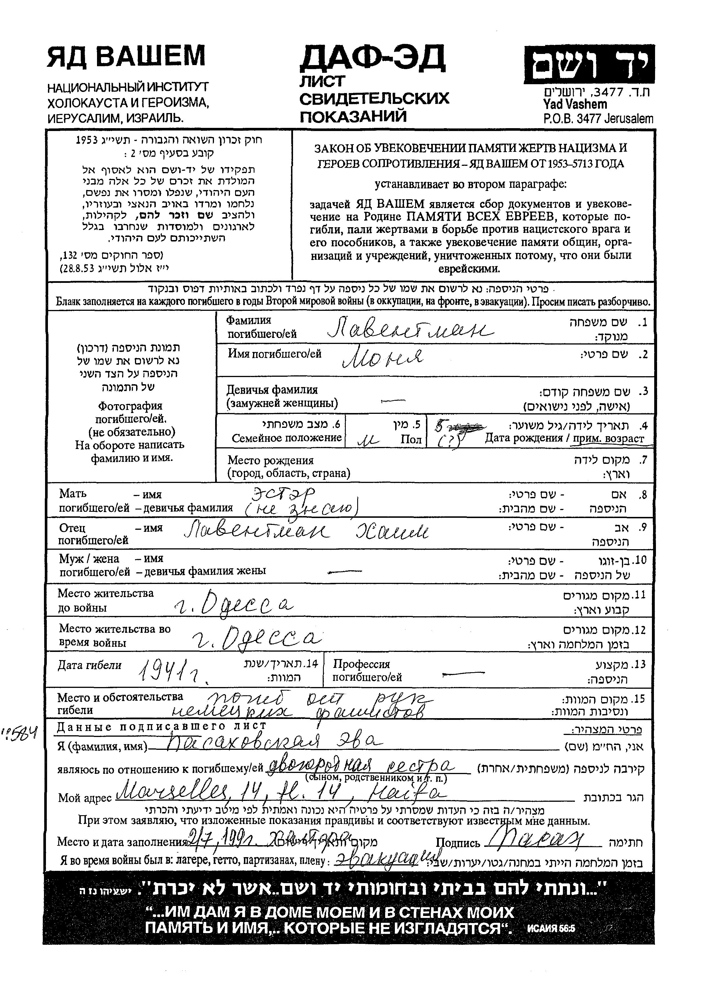 Laventman Monya Odessa, Ukraine (URSS) Feuille de témoignage