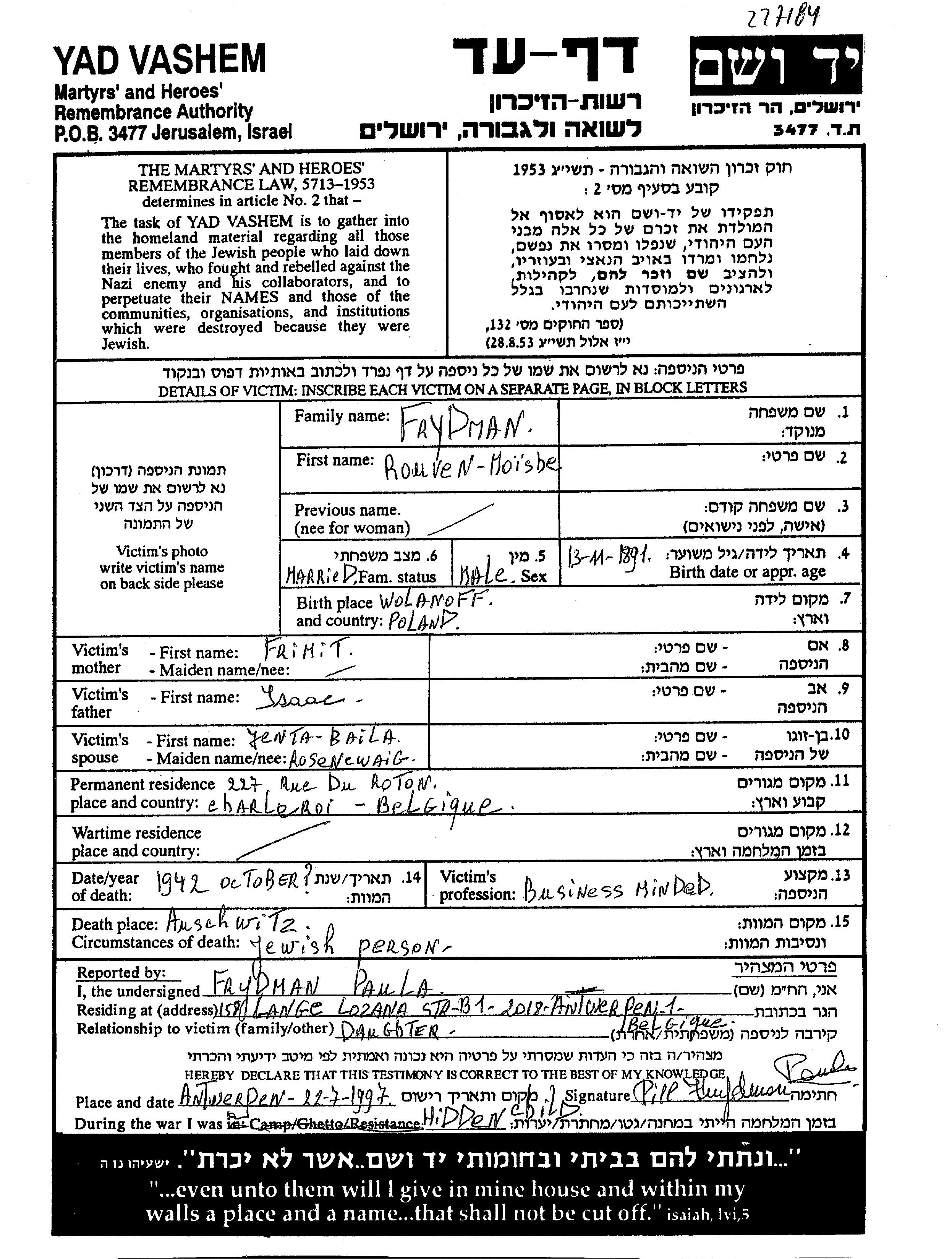 Frydman Moishe Reuven 1891 Charleroi, Belgique Feuille de témoignage