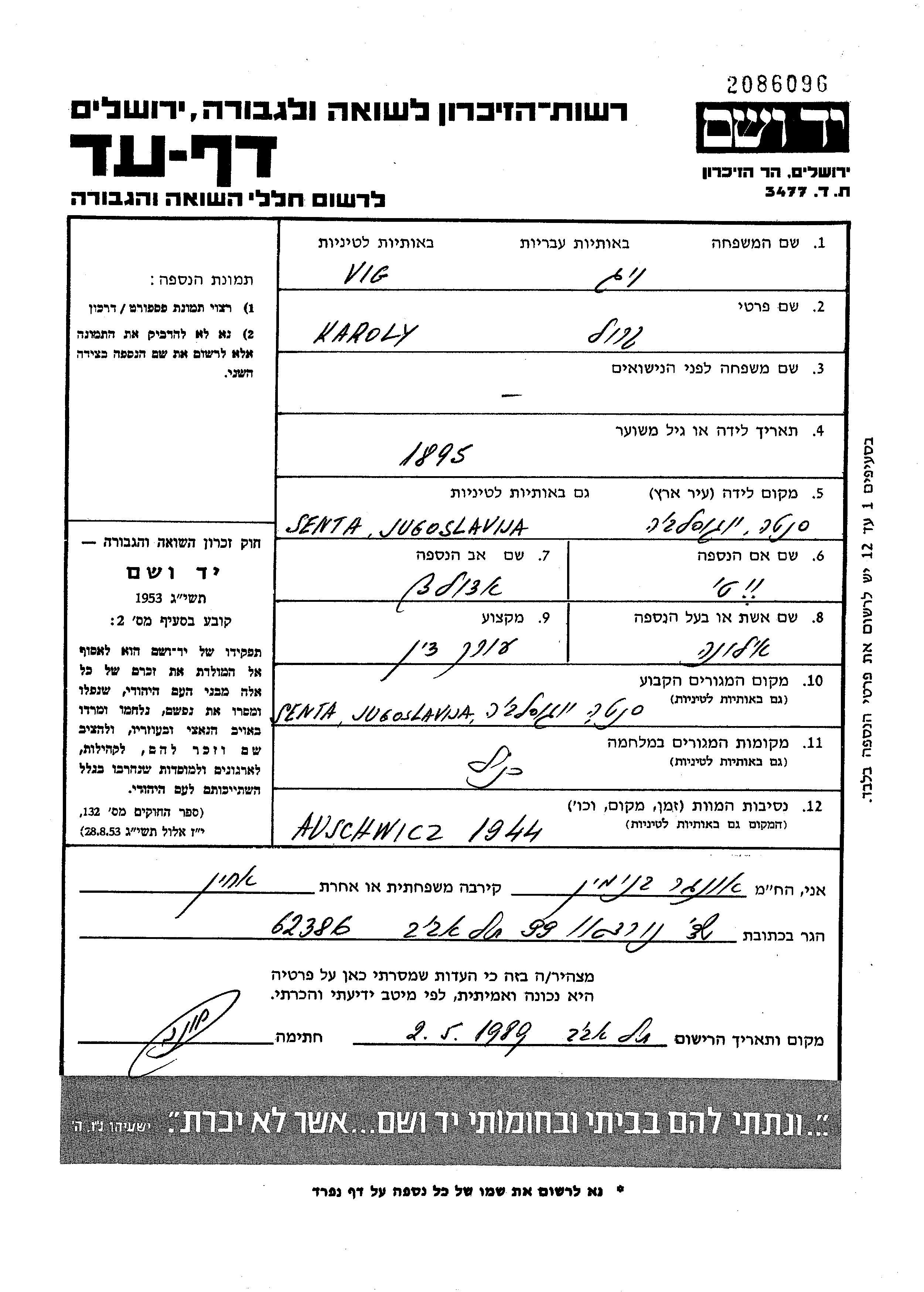 Vig Karol Zenta, Yugoslavie Feuille de témoignage