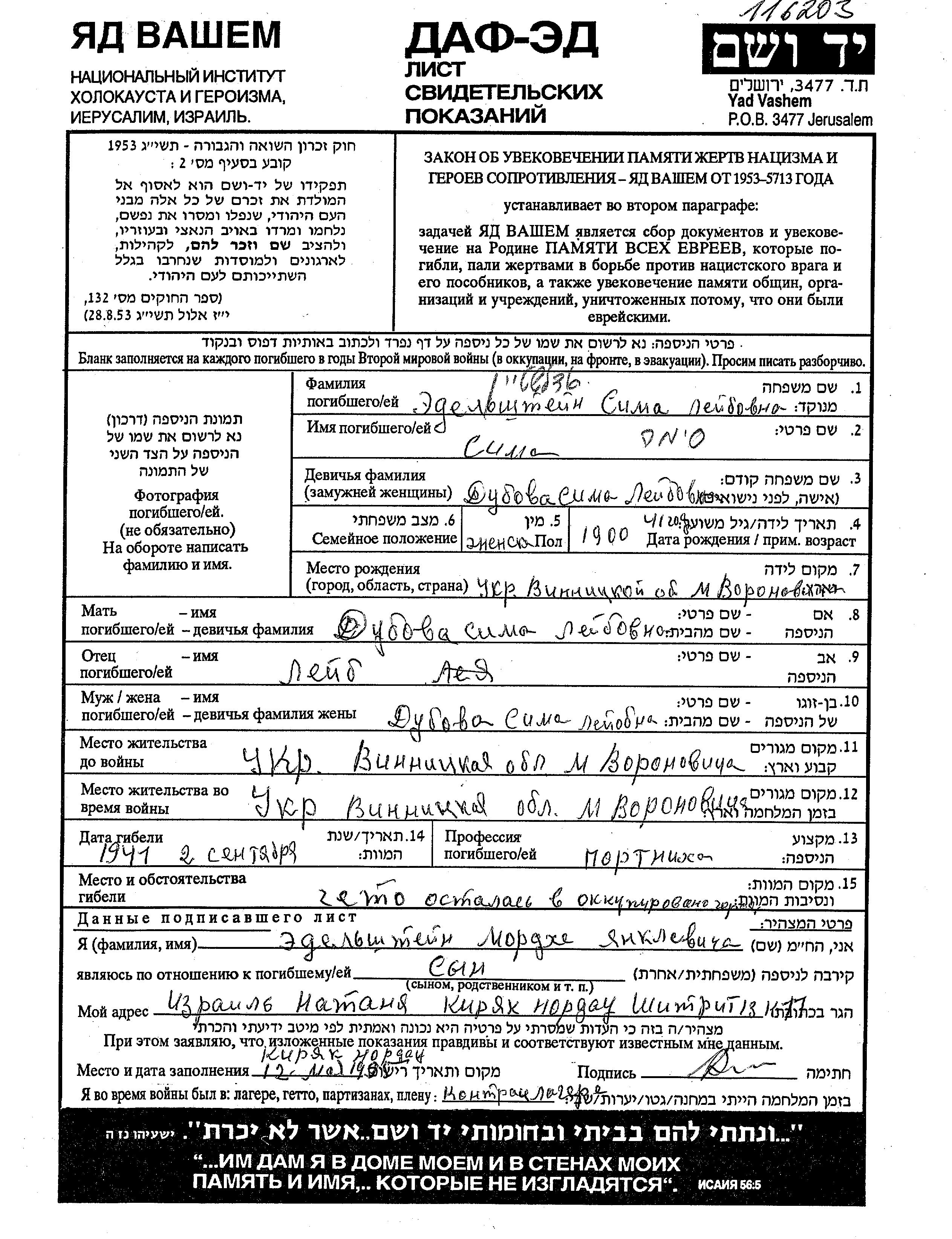 Edelshtein Sima 1900 Voronovitsa, Ukraine (URSS) Feuille de témoignage
