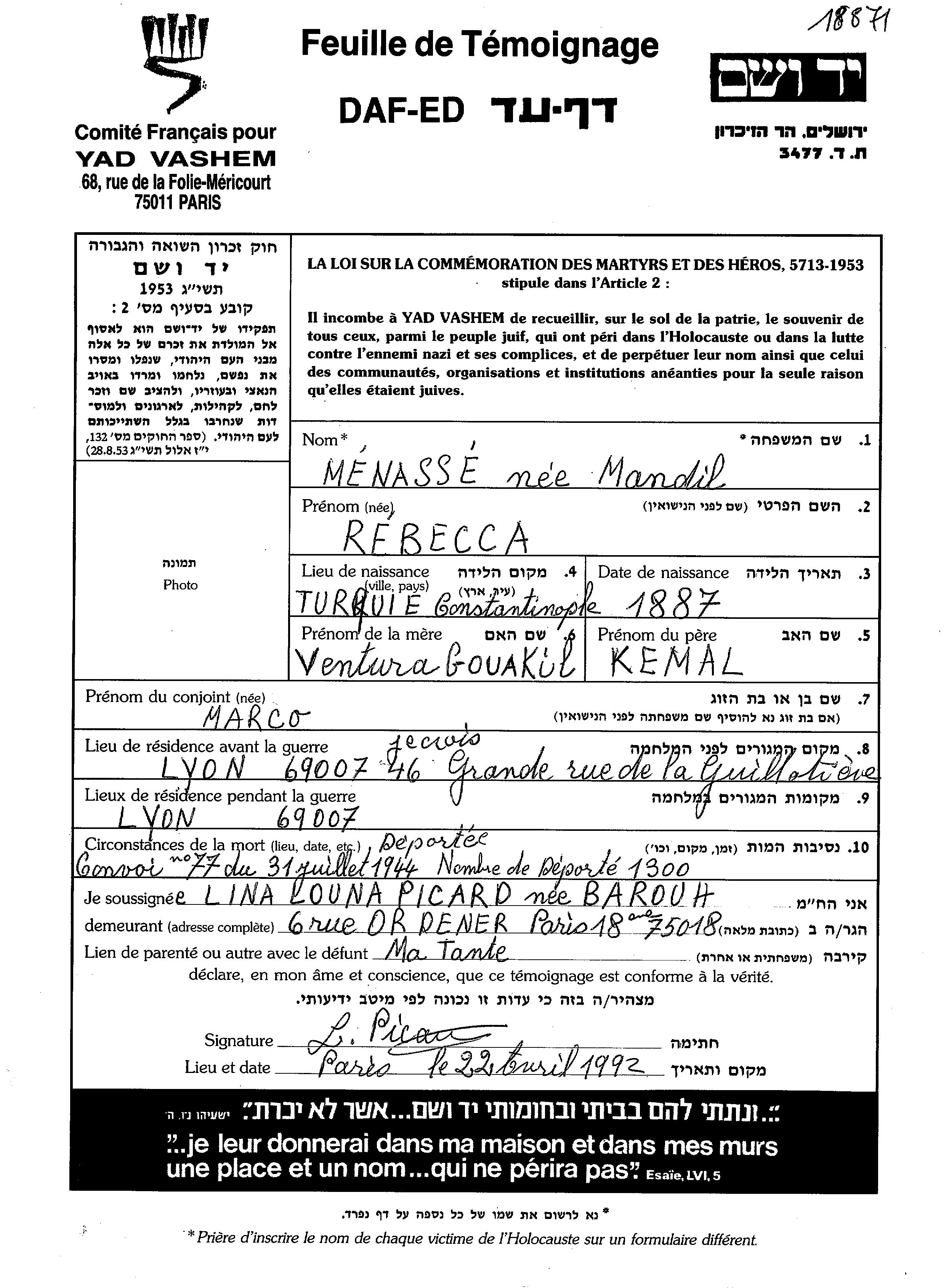 Menasse Rebecca 1887 Lyon, France Feuille de témoignage