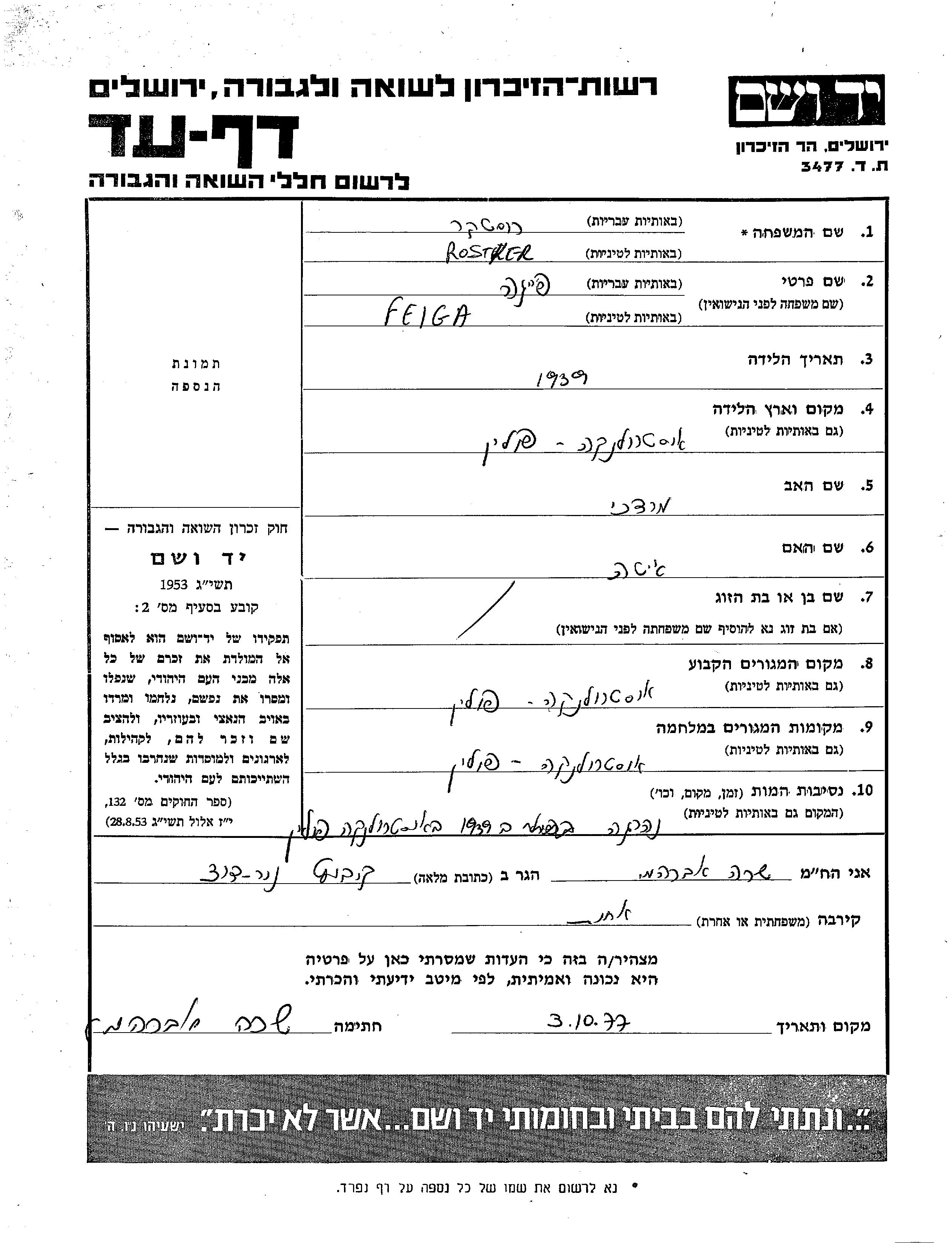 Rostker Tzipora 1939 Ostroleka, Pologne Feuille de témoignage