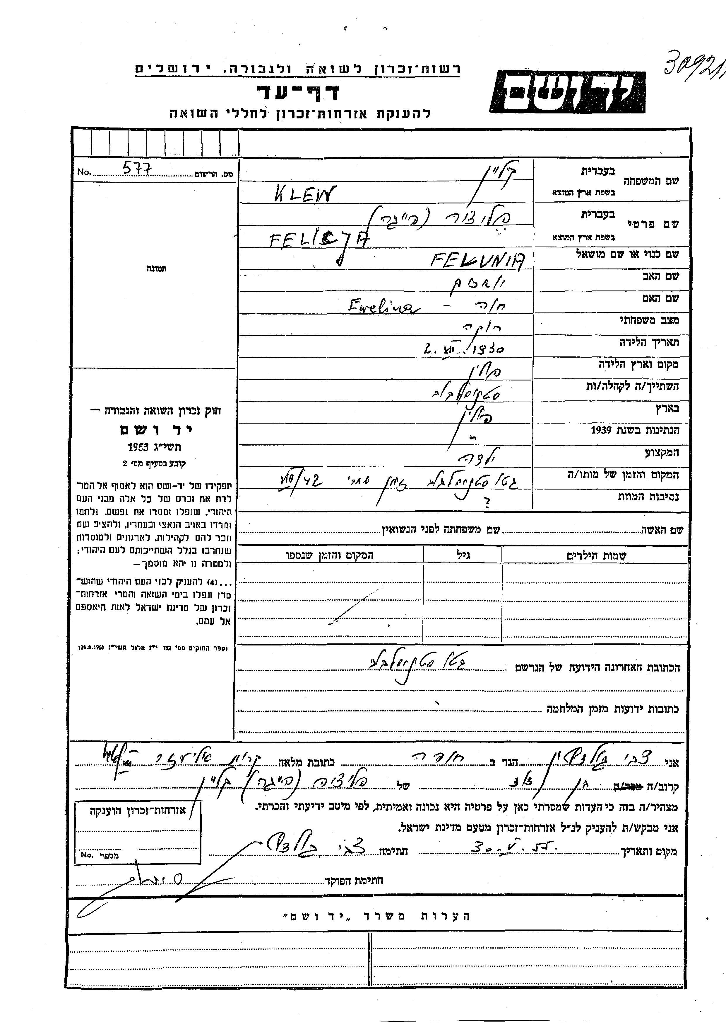 Klein | Felicja Feiga | 1930 | Stanislawow, Pologne | Feuille de témoignage |