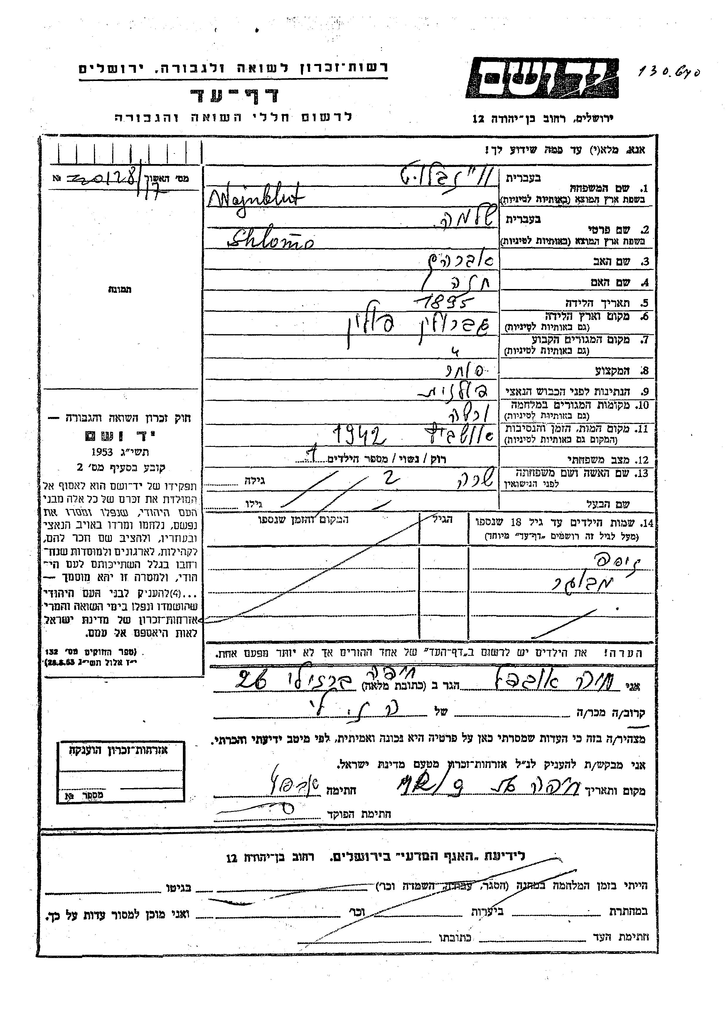 Weinblut Shlomo 1895 Garwolin, Pologne Feuille de témoignage