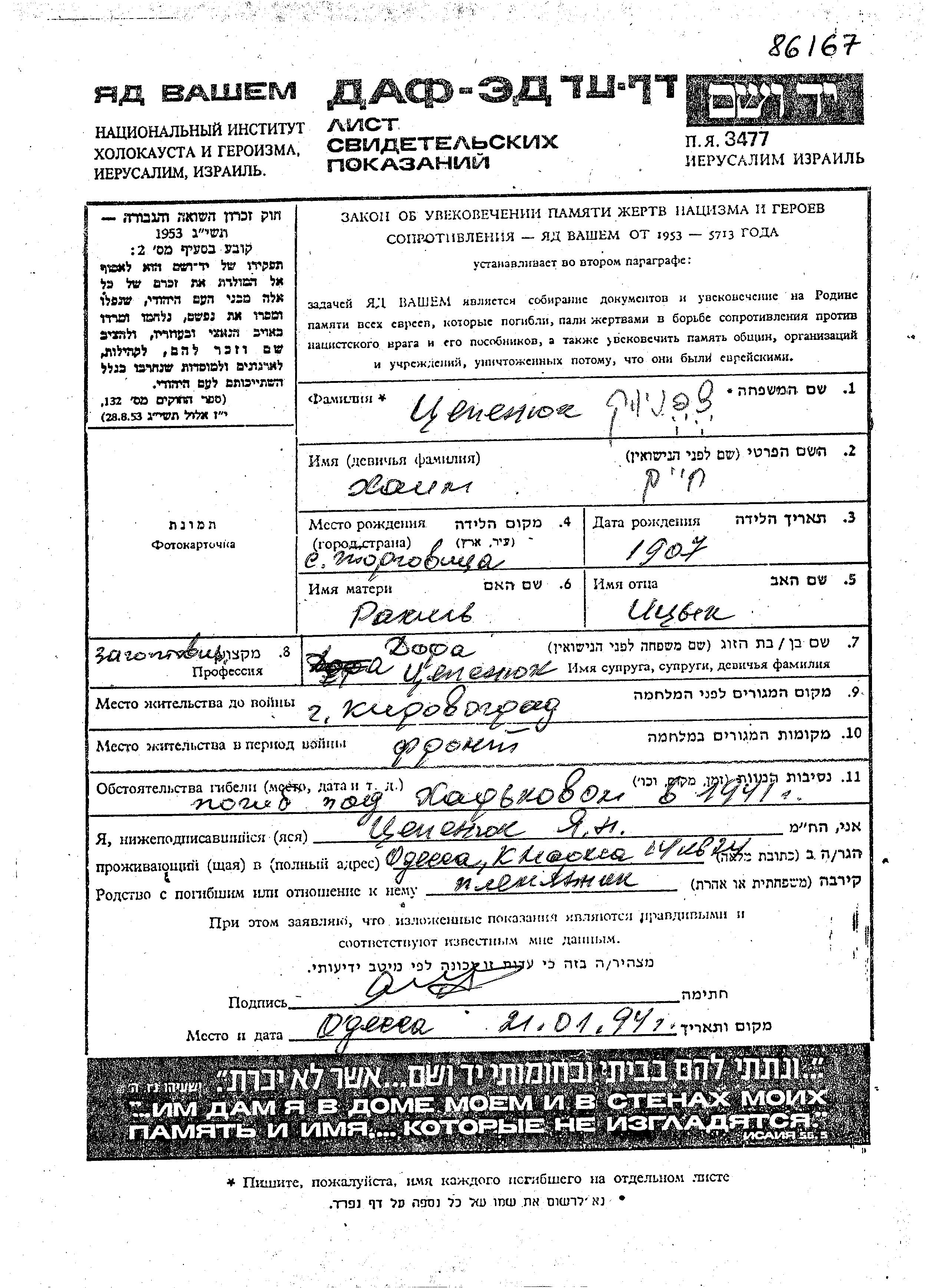 Tzepenyuk | Khaim | 1907 | Kirovograd, Ukraine (URSS) | Feuille de témoignage |