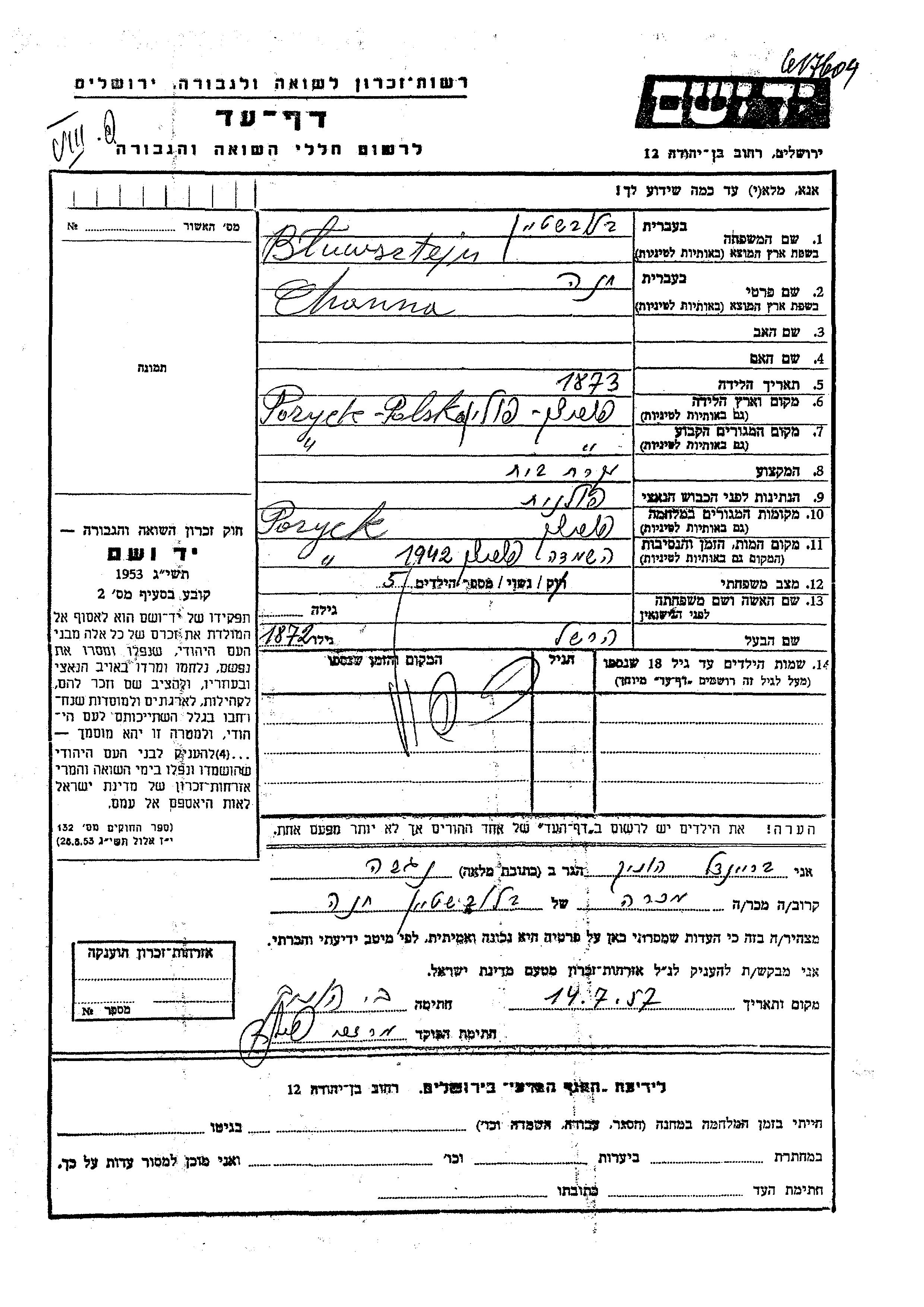 Channa a été assassinée pendant la Shoah. Lieu de la mort: Poryck, Pologne en 1942.