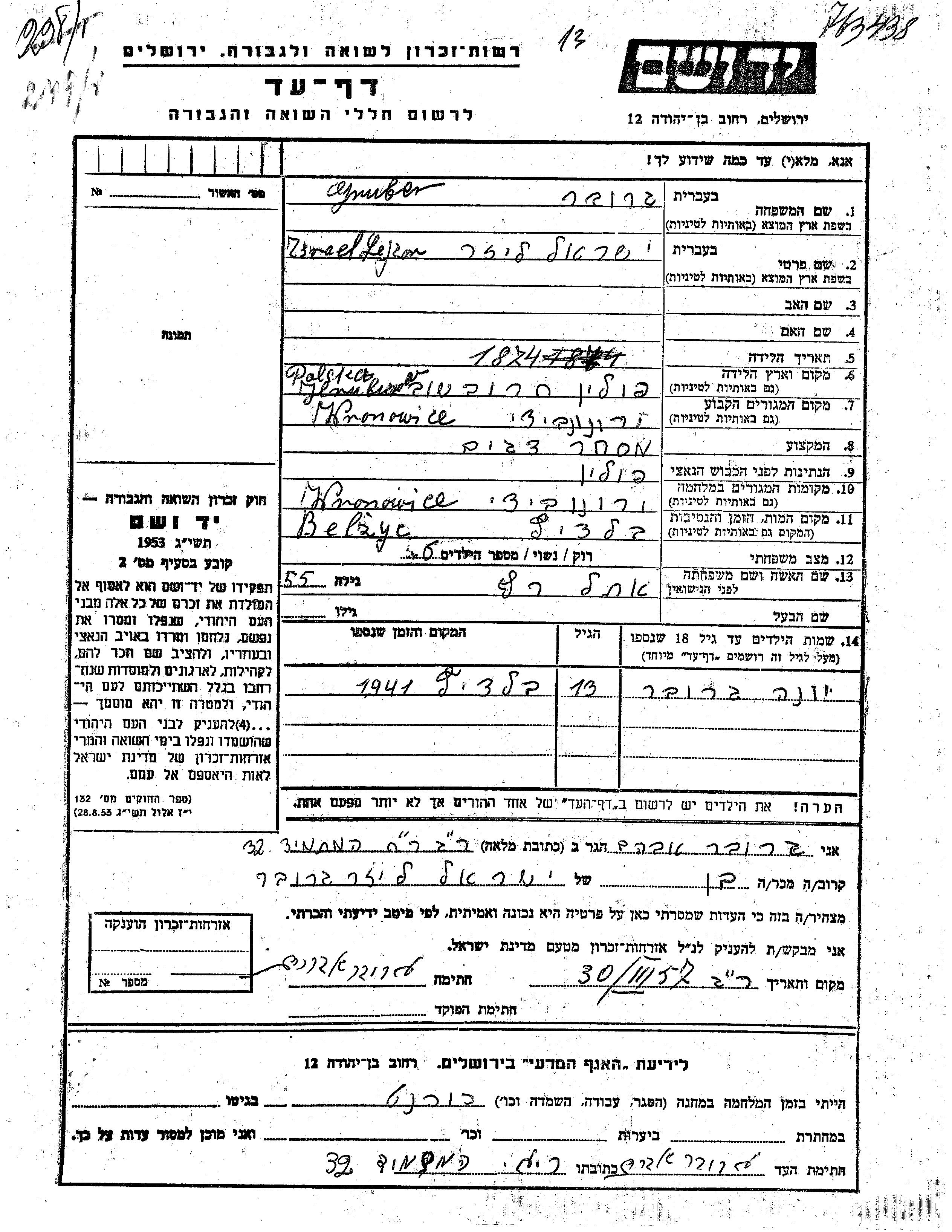 Gruber Yona Wronowice, Pologne Feuille de témoignage