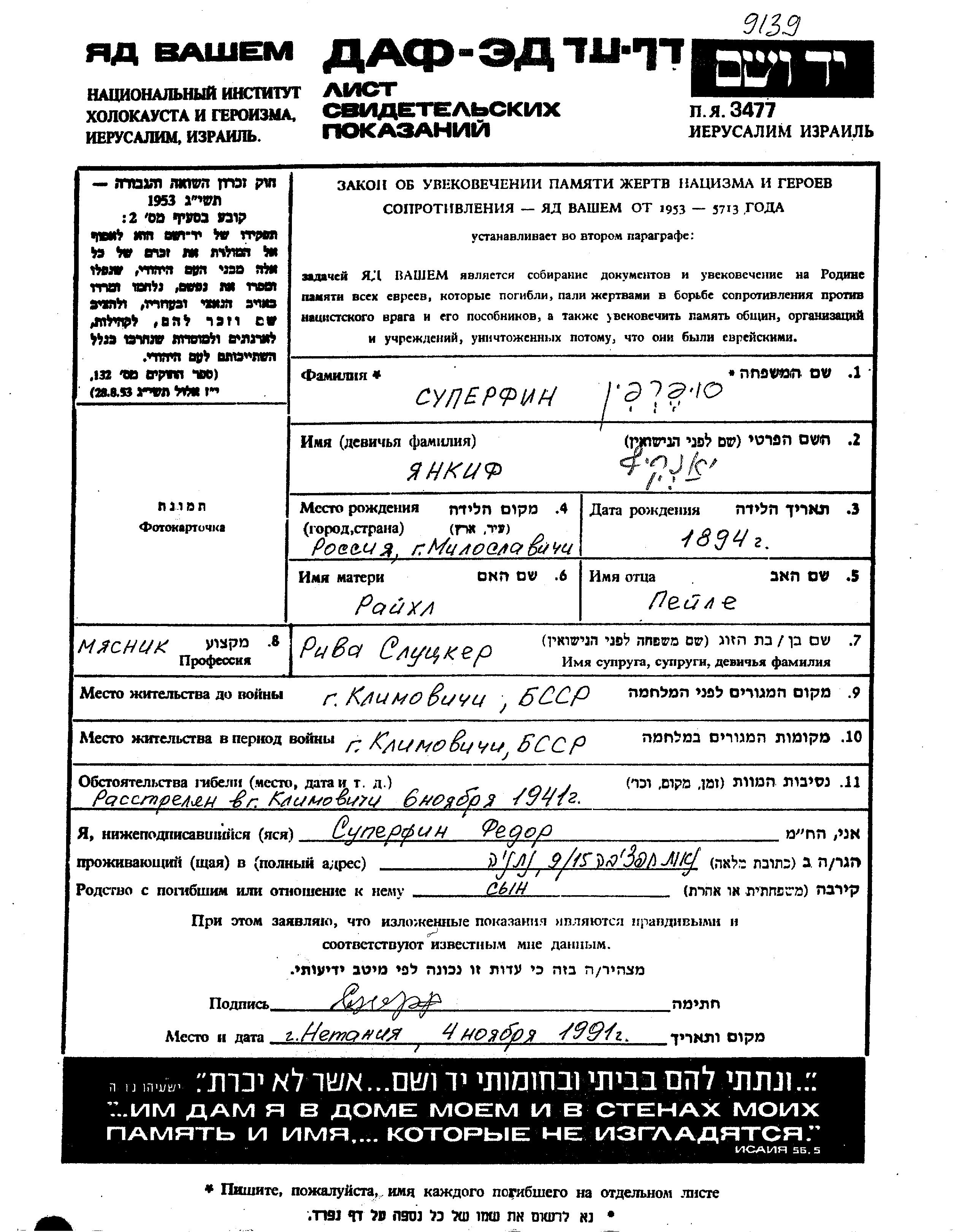 Superfin Yankel Klimovichi, Bélorussie (URSS) Feuille de témoignage