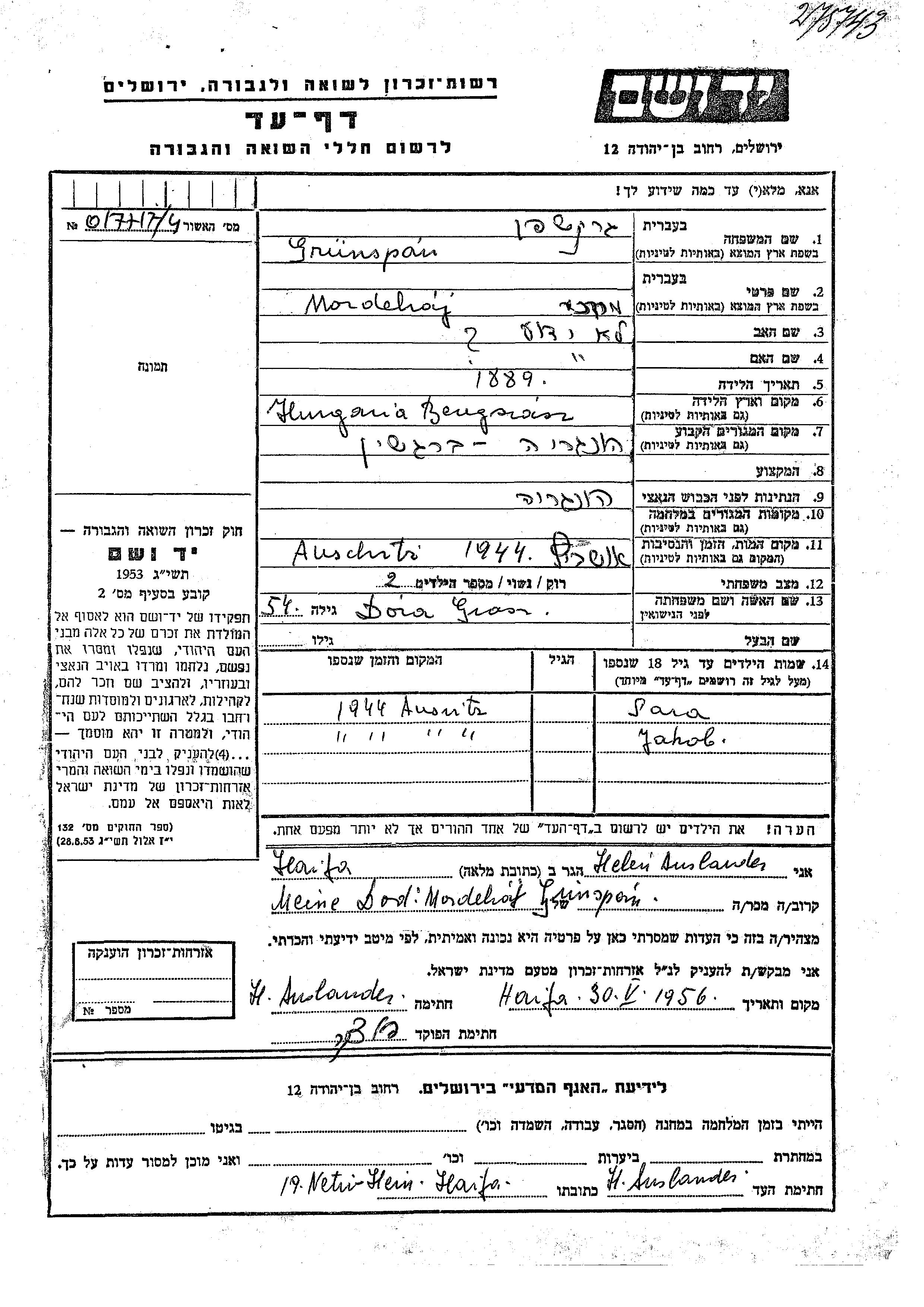 Grunspan Jakob Beregszasz, Tchécoslovaquie Feuille de témoignage