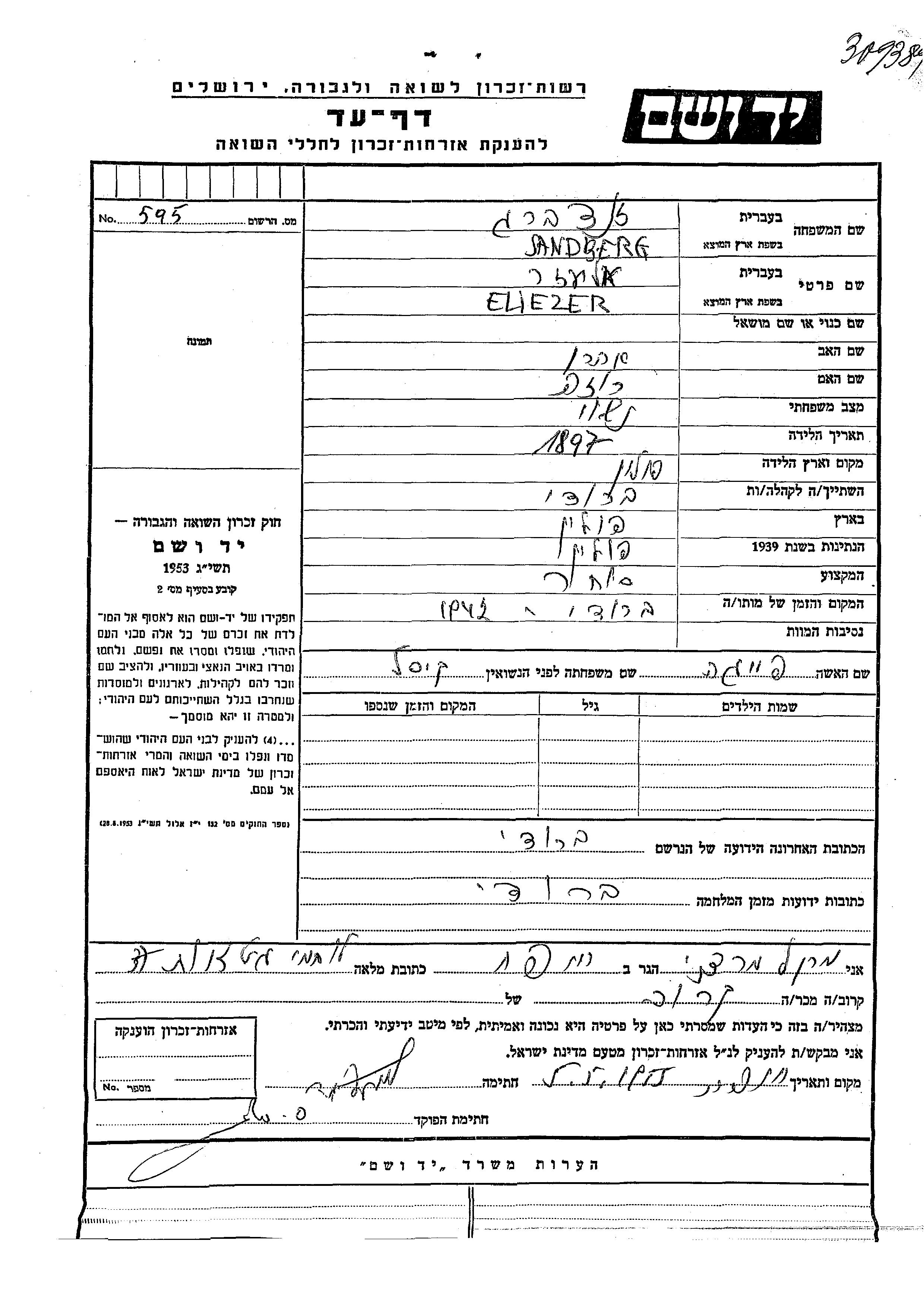 Sandberg Eliezer 1897 Brody, Pologne Feuille de témoignage