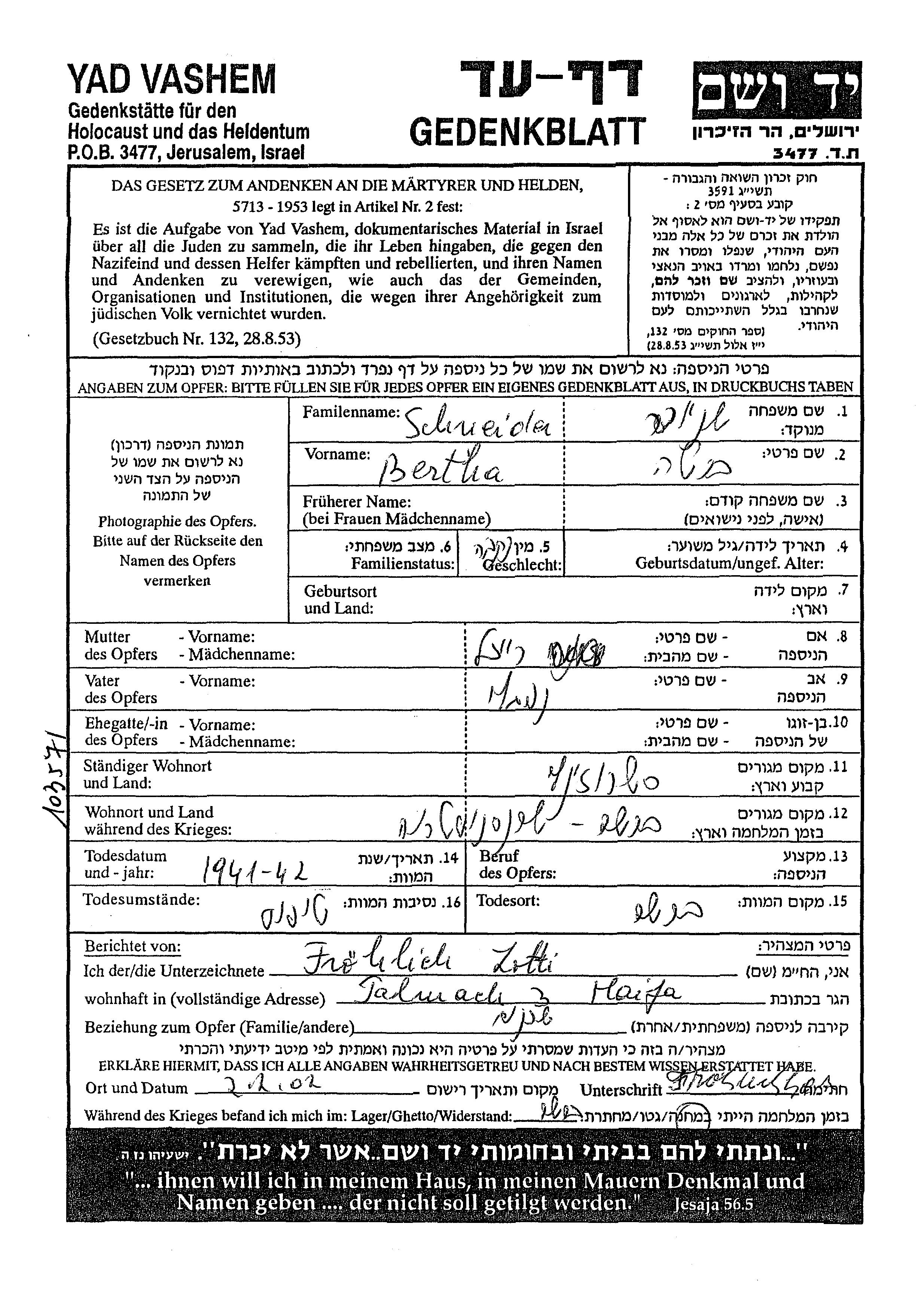 Schneider Bertha Storojinet, Roumanie Feuille de témoignage