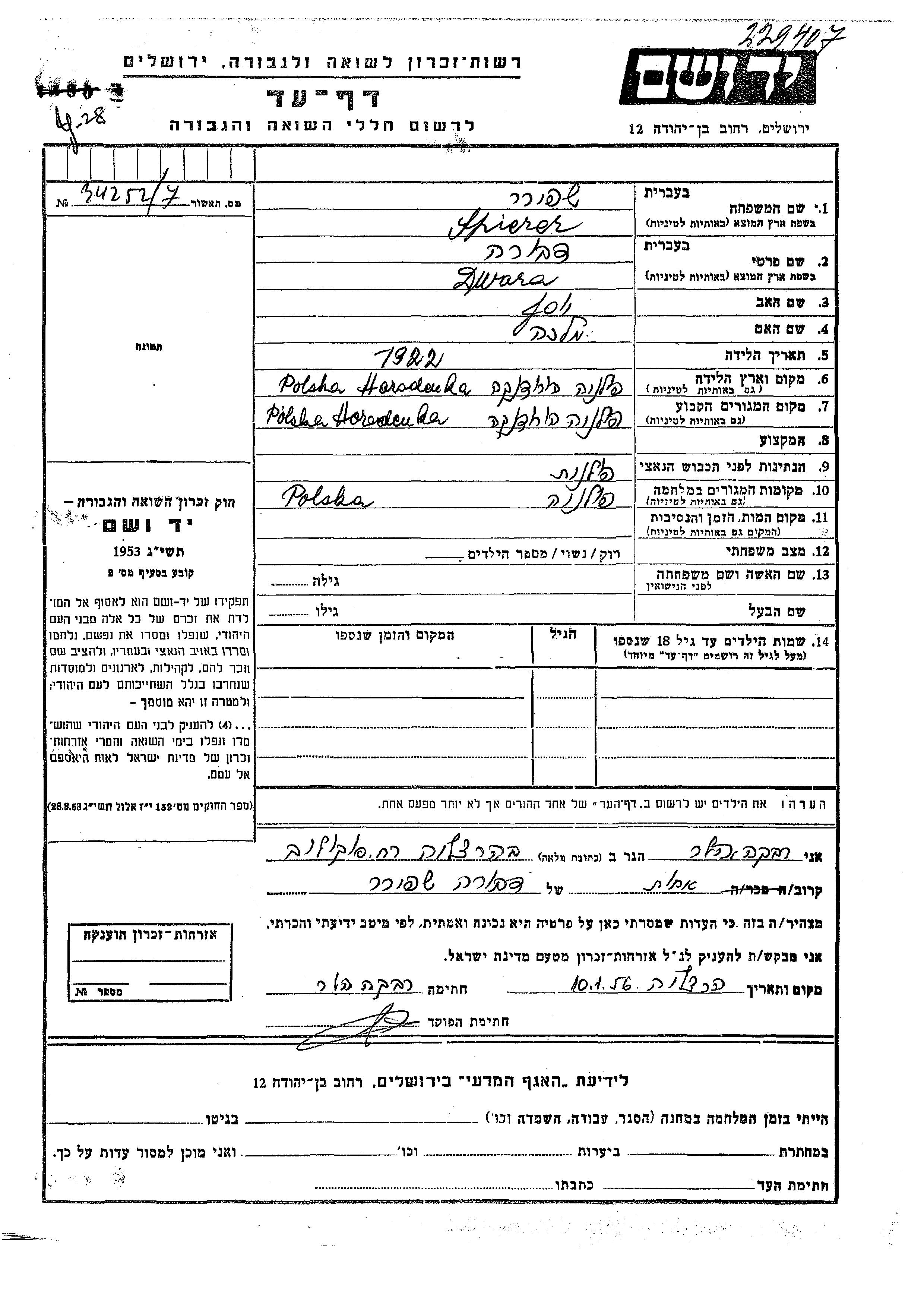 Spierer Dwora 1922 Horodenka, Pologne Feuille de témoignage