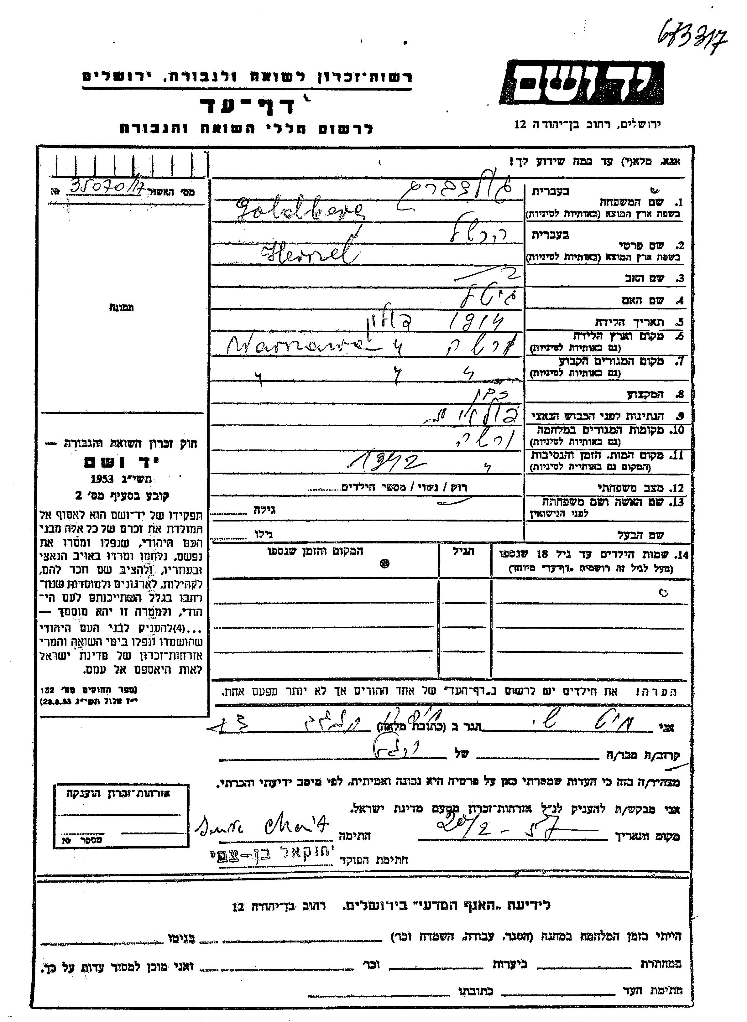 Goldberg | Herszel | 1914 | Warsaw, Pologne | Feuille de témoignage |