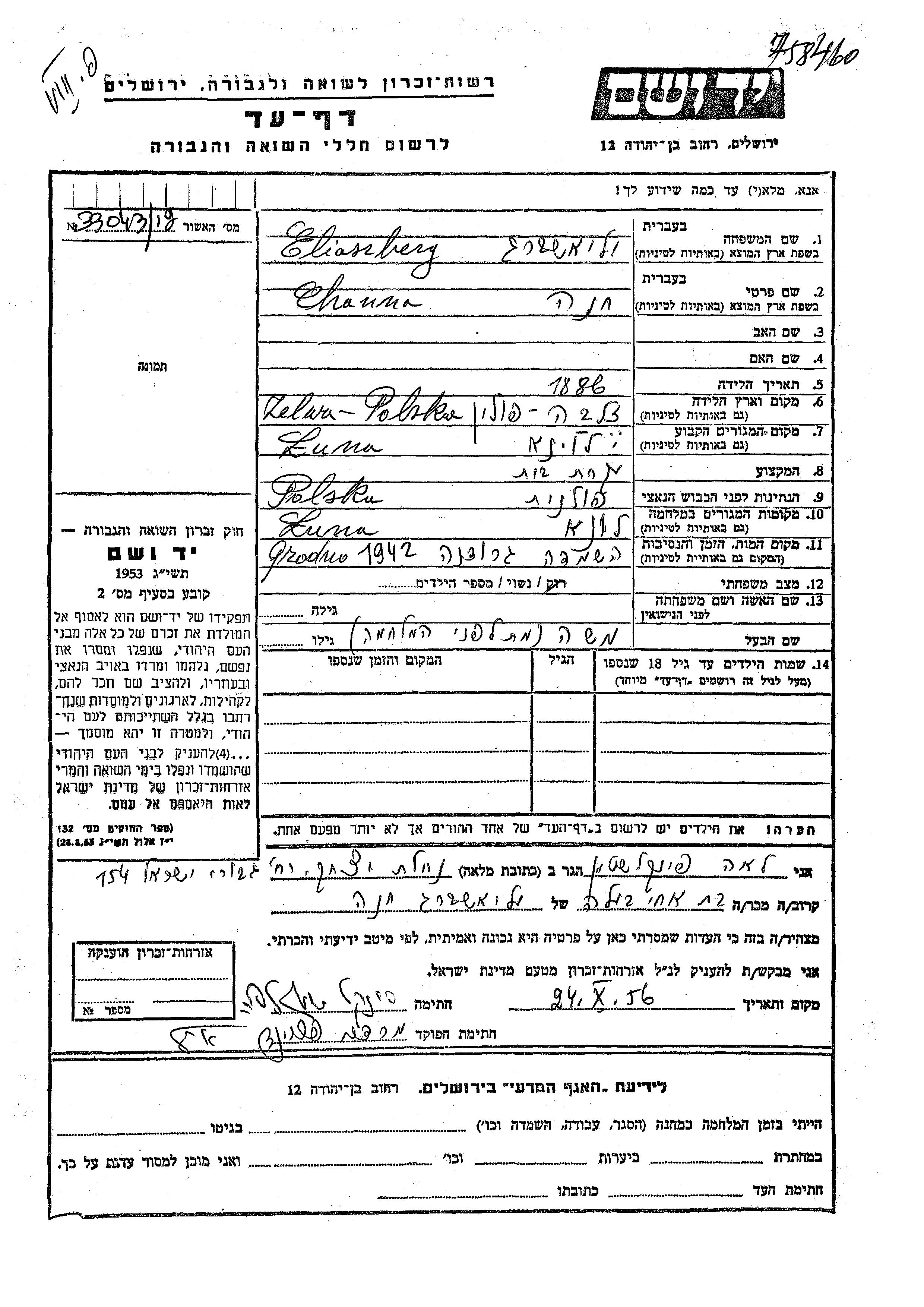 Eliaszberg Channa 1886 Luna, Pologne Feuille de témoignage