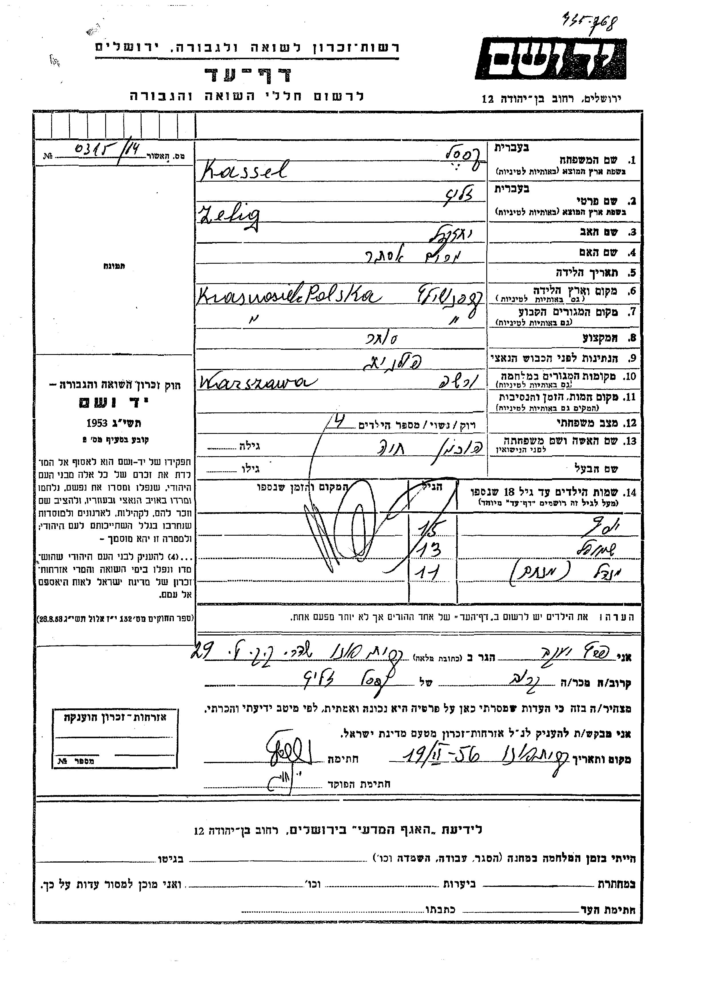 Kassel Mendel Menakhem 1930 Krasnosielc, Pologne Feuille de témoignage