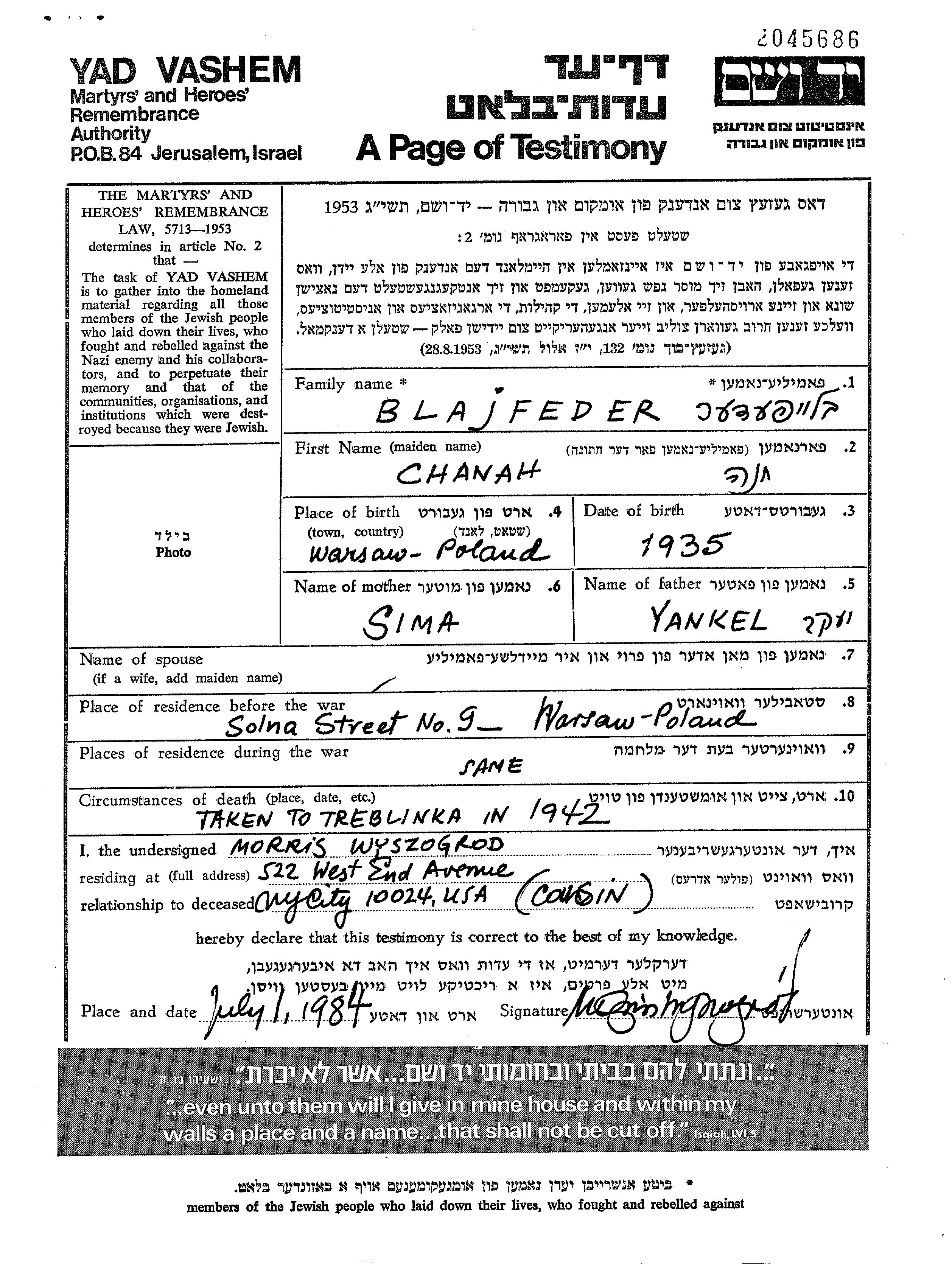 Blajfeder | Chanah | 1935 | Warszawa, Pologne | Feuille de témoignage |