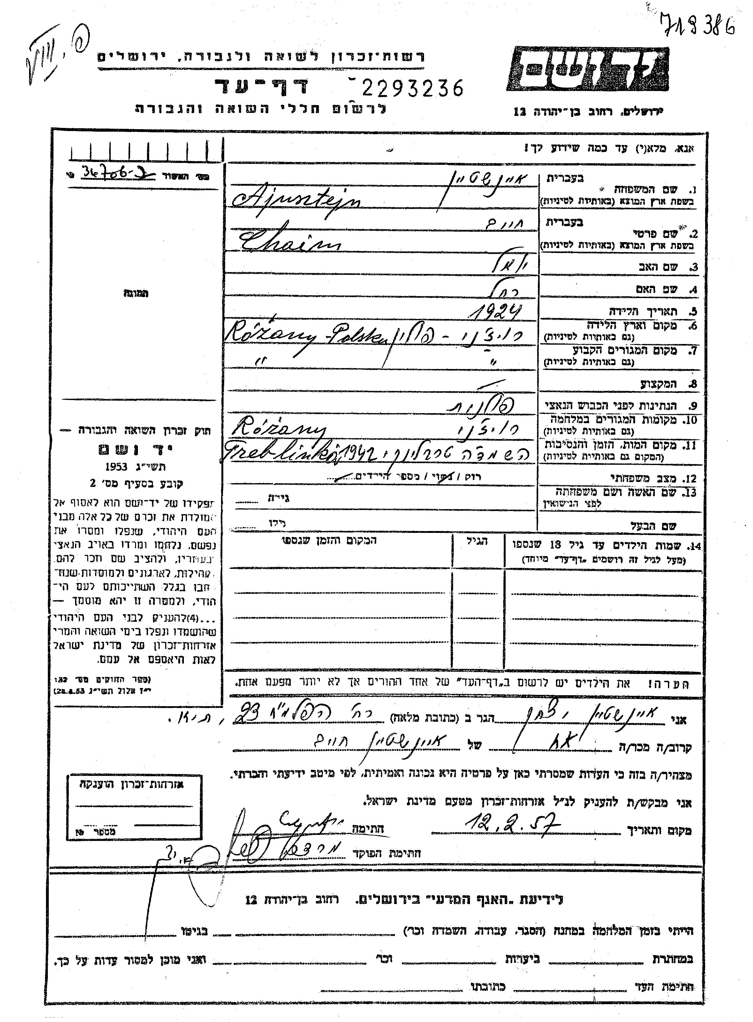 Ajnstejn Chaim 1924 Rozana, Pologne Feuille de témoignage