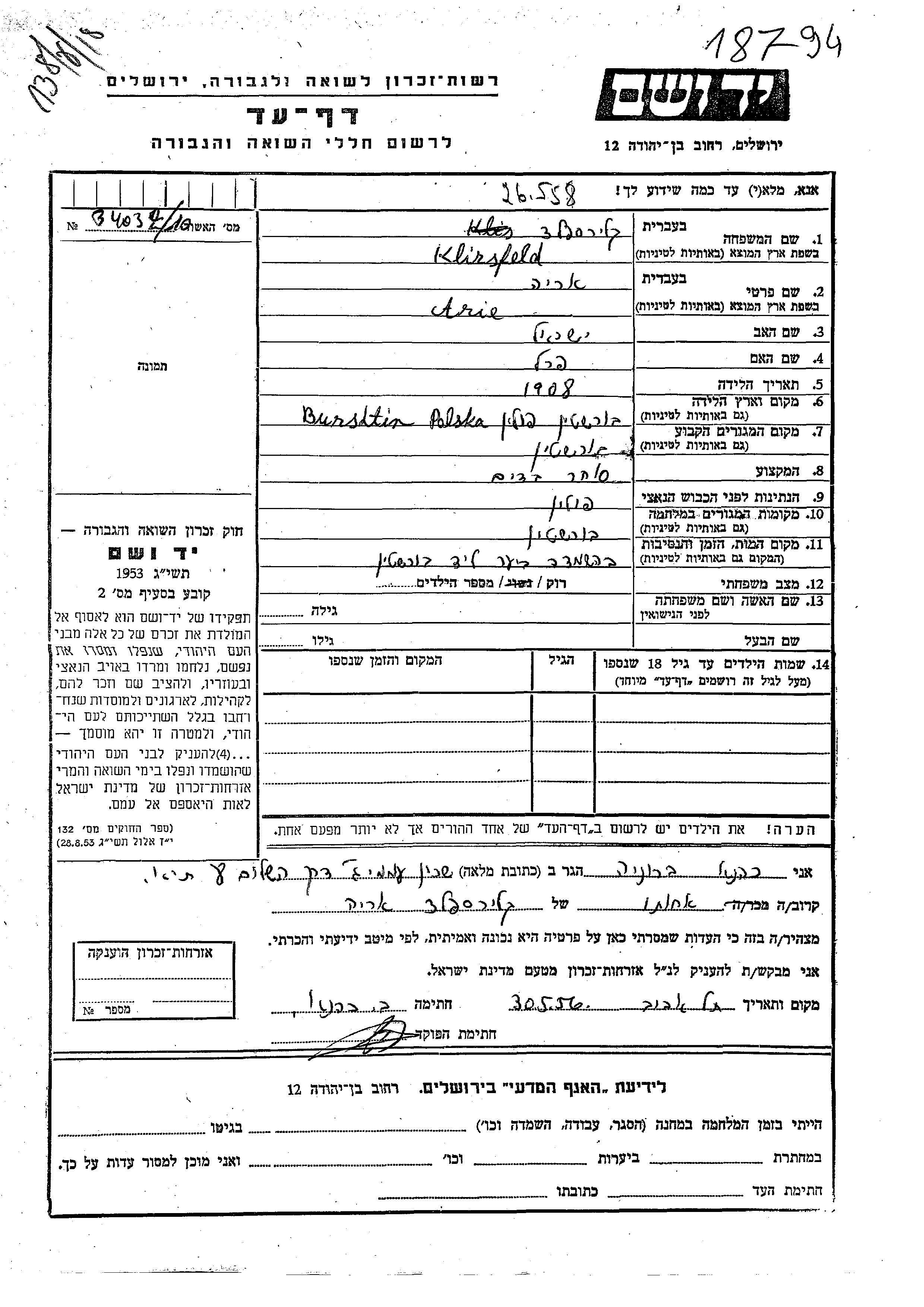 Klirsfeld Arie 1908 Burshtin, Pologne Feuille de témoignage