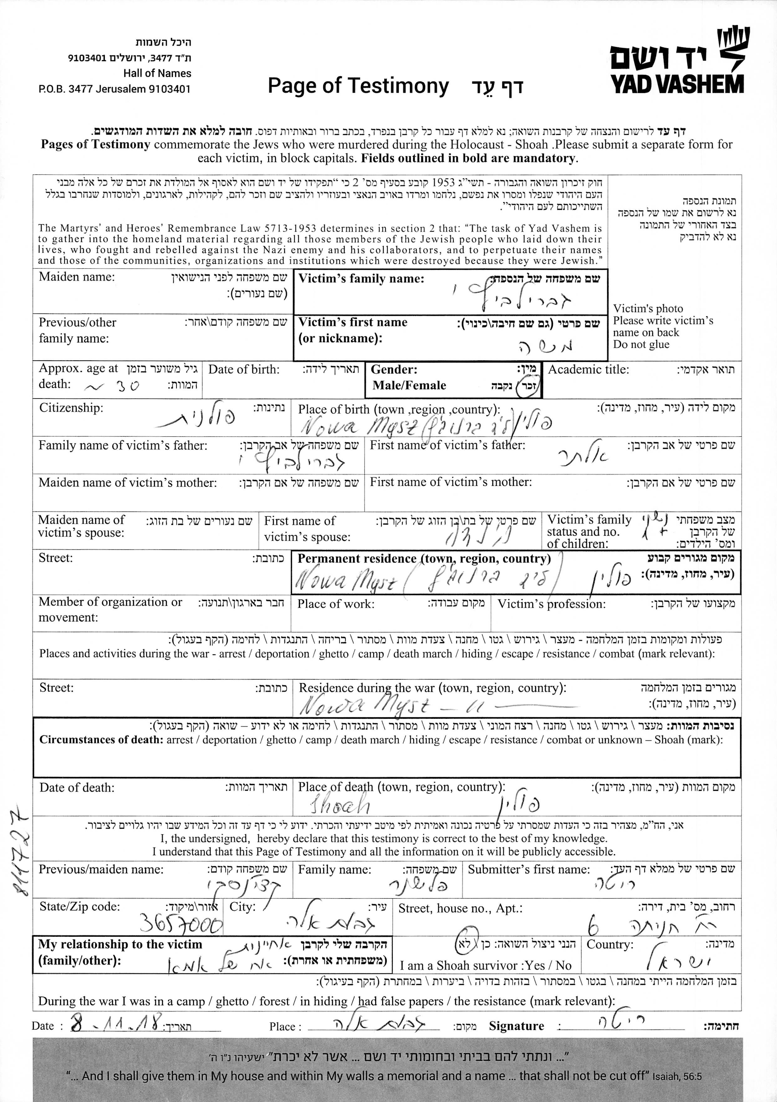 Gabrilevitz | Moshe | Nowa Mysz, Pologne | Feuille de témoignage | |