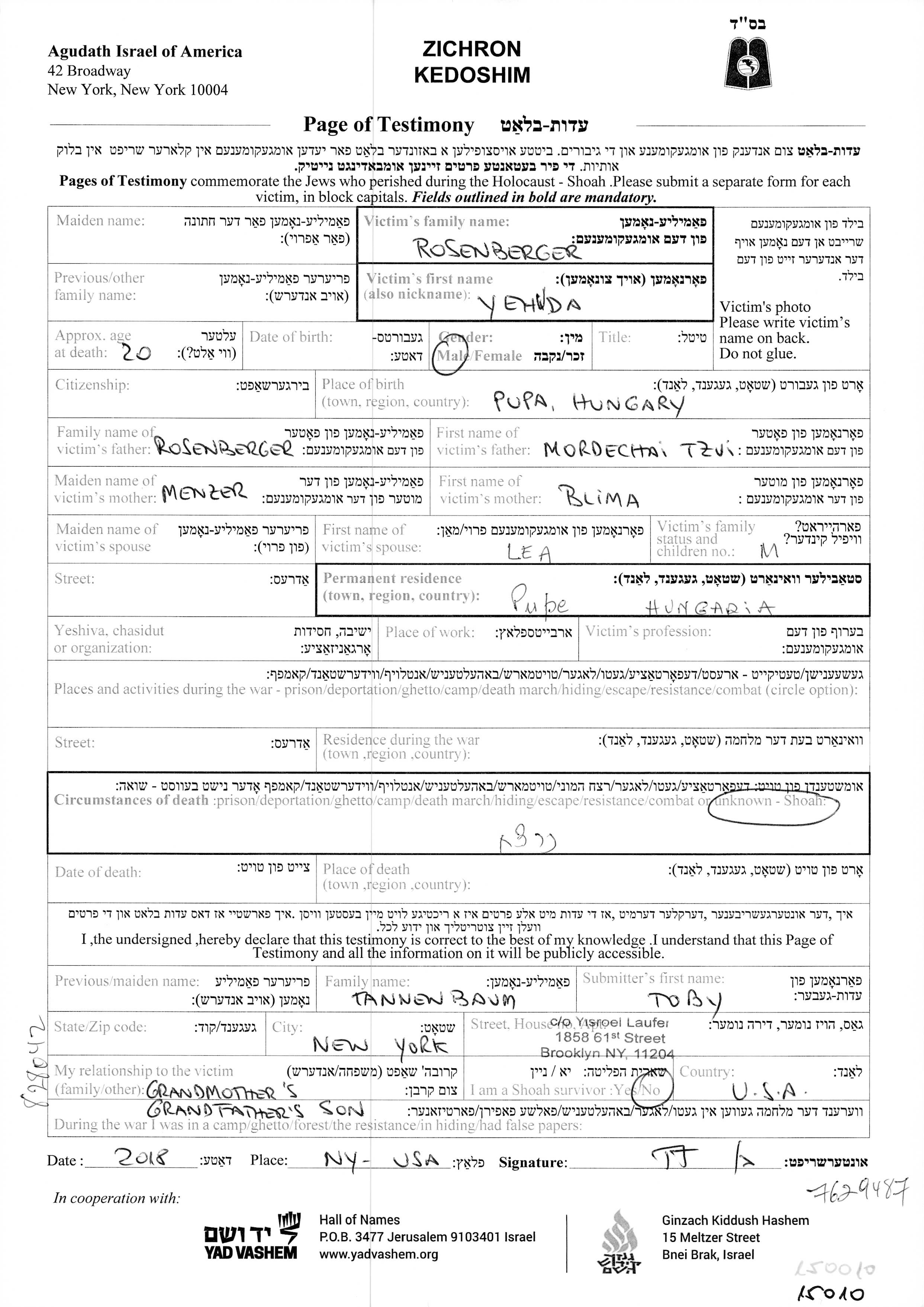 Rosenberger Yehuda Papa, Hongrie Feuille de témoignage