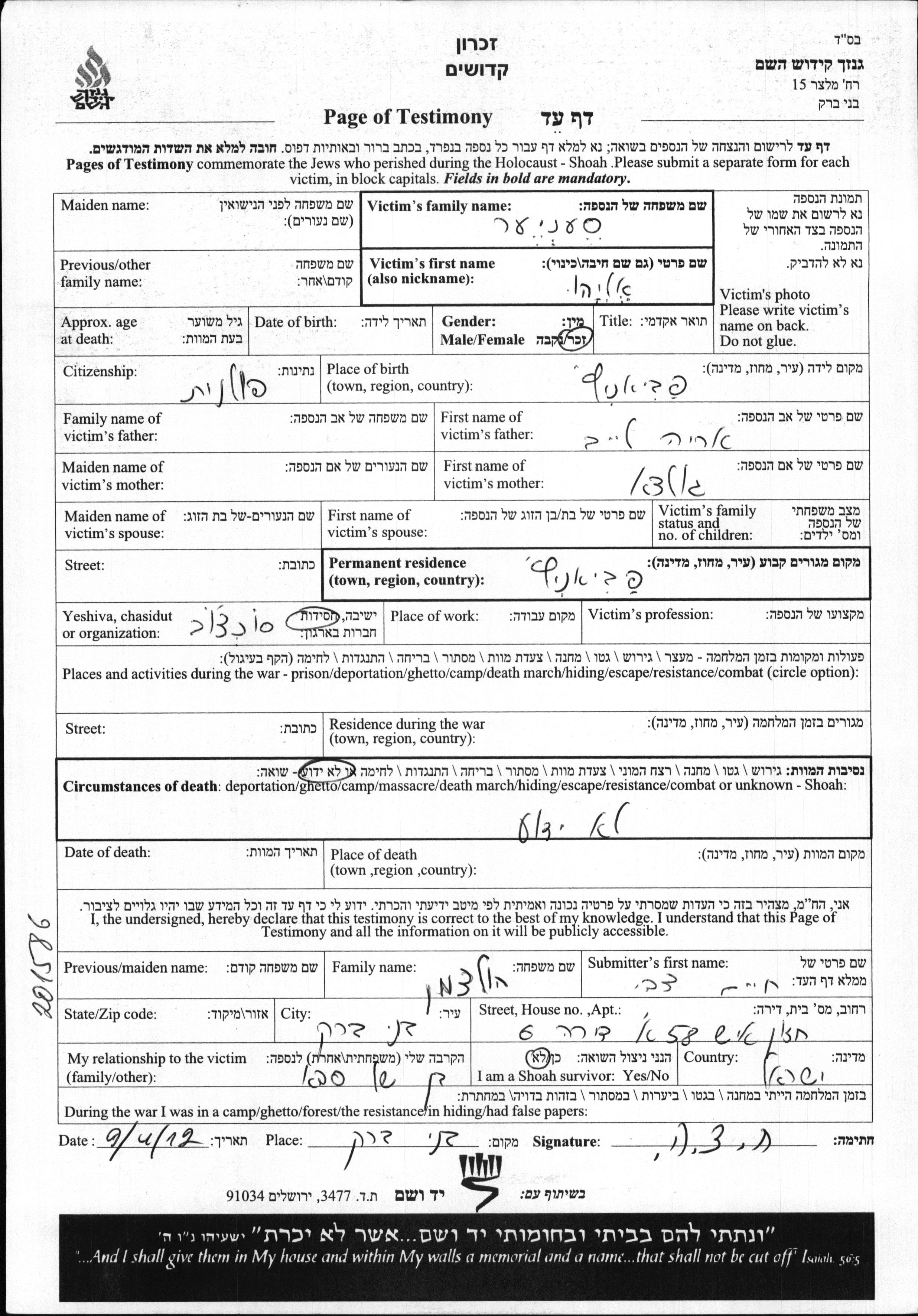 Yad Vashem - Pages of Testimony Names Memorial Collection