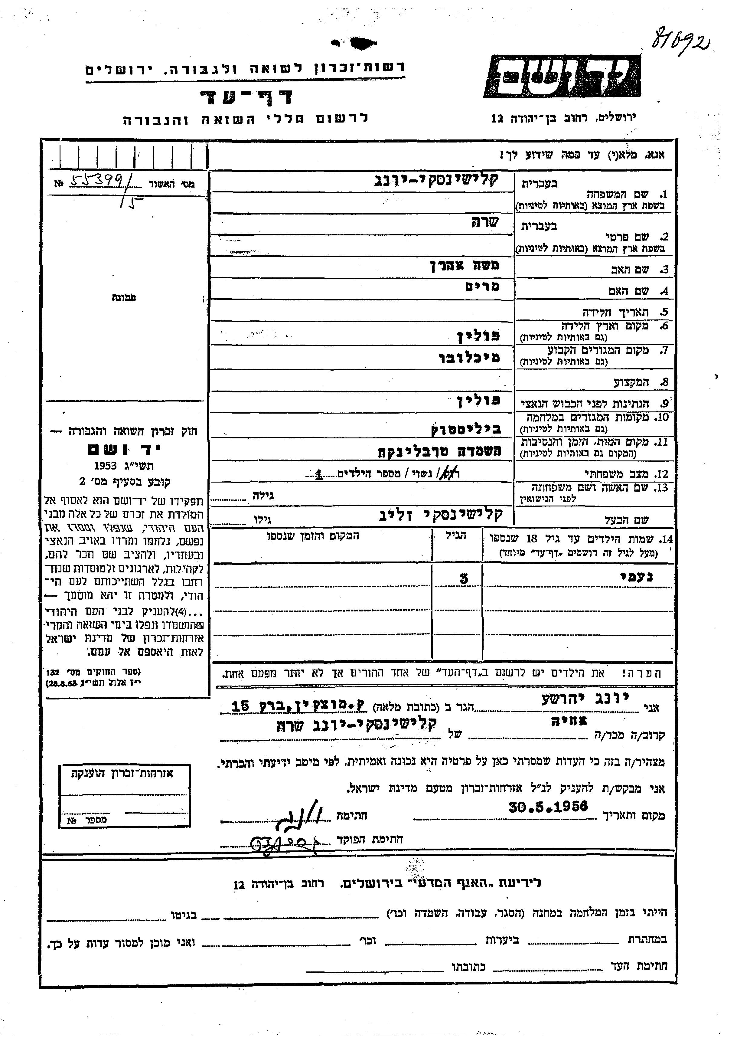 Kalishinski Naomi Michalova, Pologne Feuille de témoignage