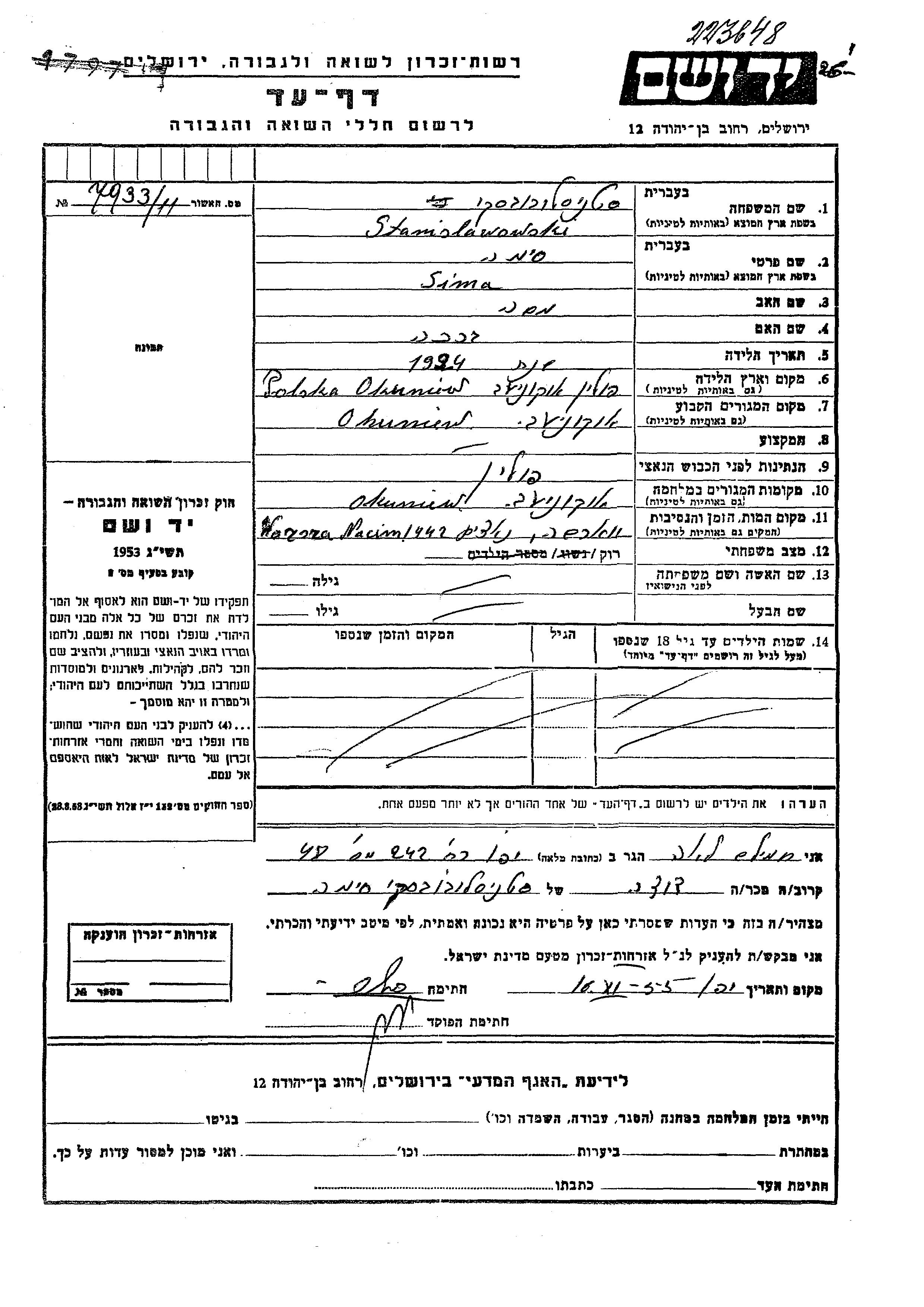 Stanislawowski Sima Okuniew, Pologne Feuille de témoignage