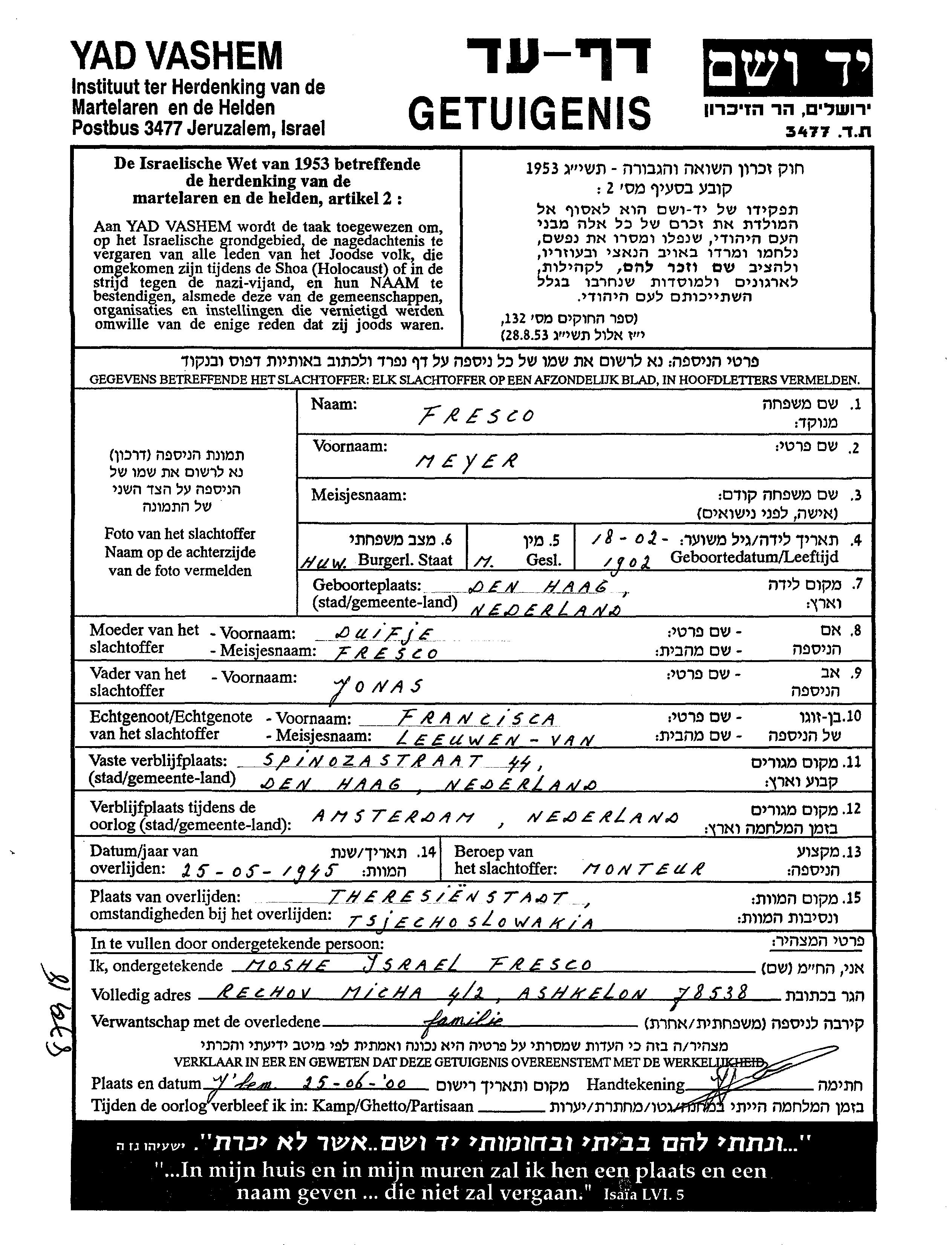 Meyer Fresco est né à S Gravenhage, Pays-Bas en 1902. Il était Monteur. Avant la seconde guerre mondiale il vivait à Den Haag, Pays-Bas.
