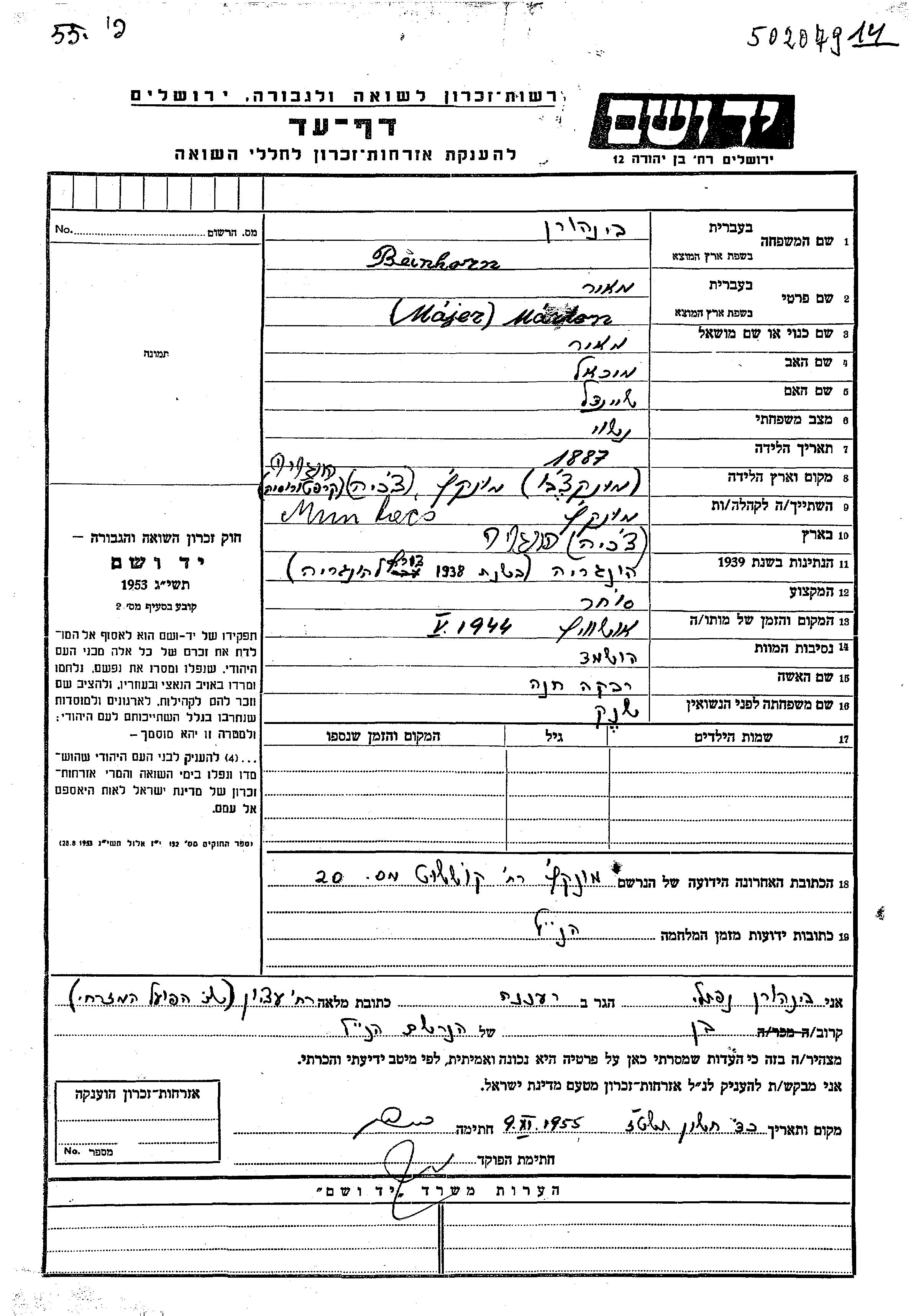 Beinhorn | Majer | 1887 | Munkacs, Tchécoslovaquie | Feuille de témoignage |