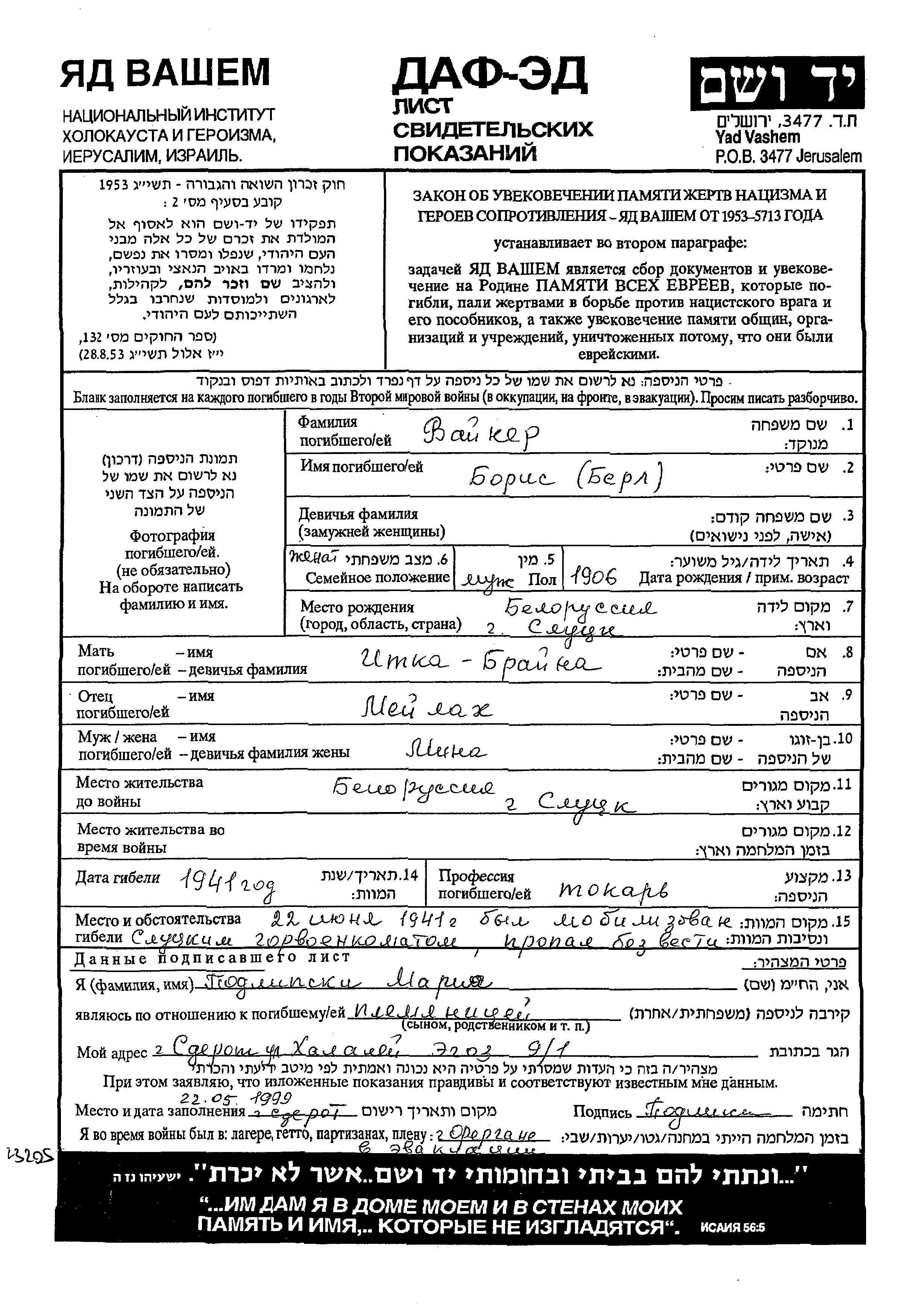 Vainer Boris 1906 Slutsk, Bélorussie (URSS) Feuille de témoignage