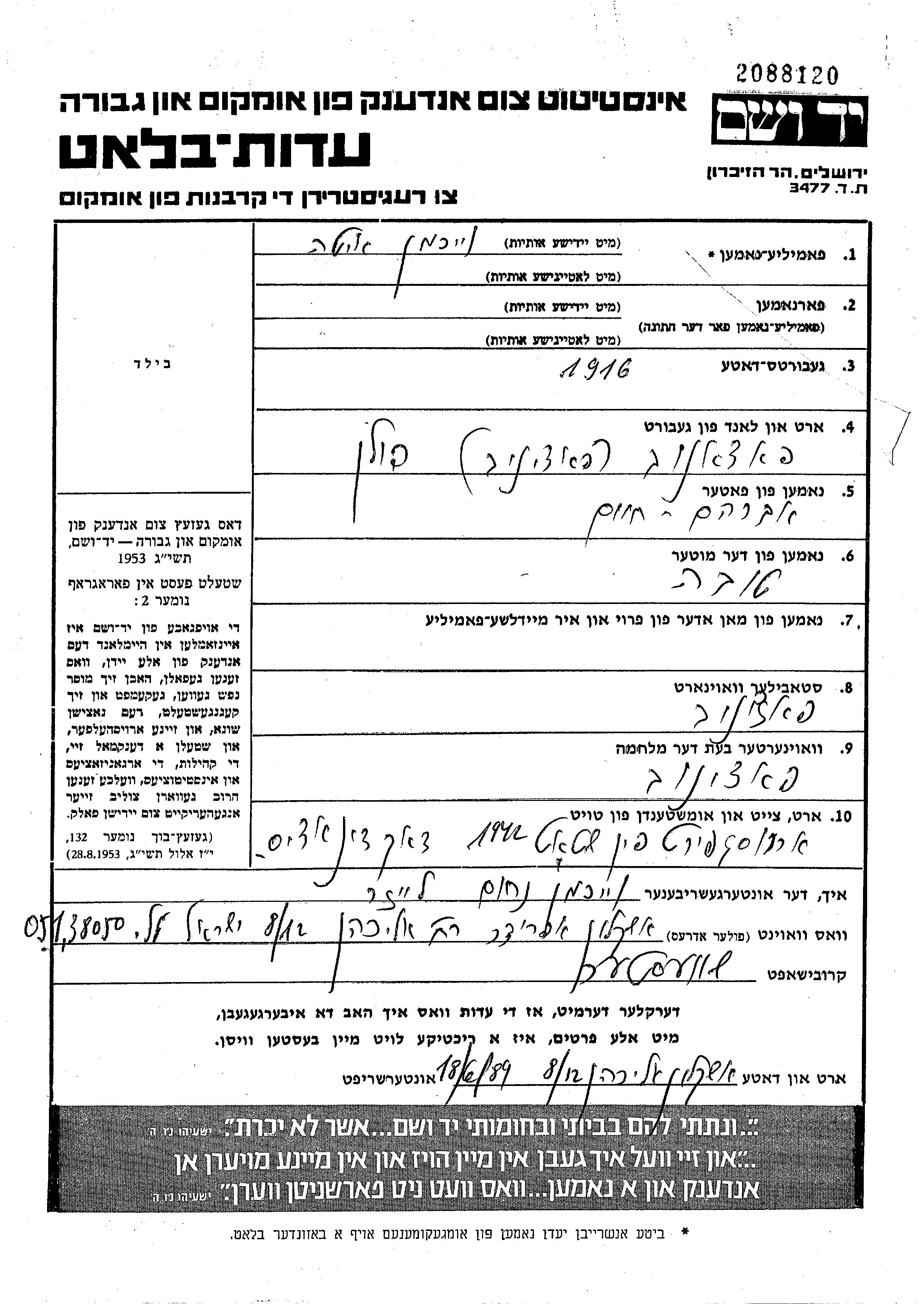 Veikhman | Ita | Pacanow, Pologne | Feuille de témoignage | |